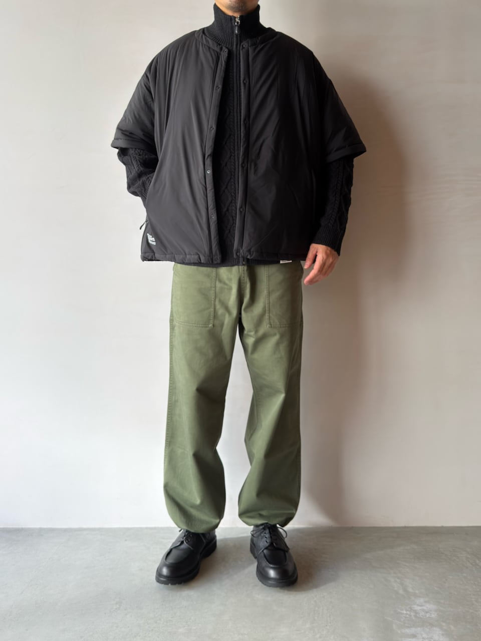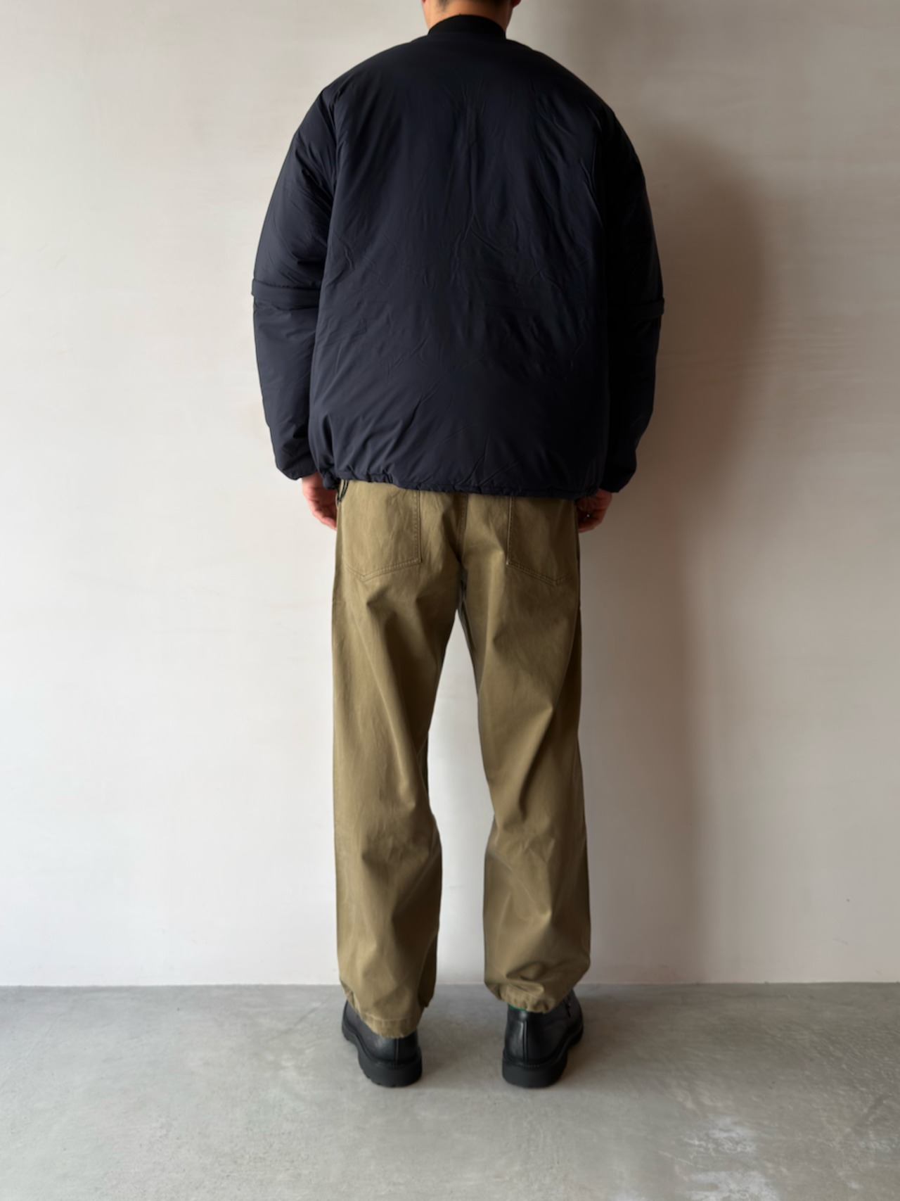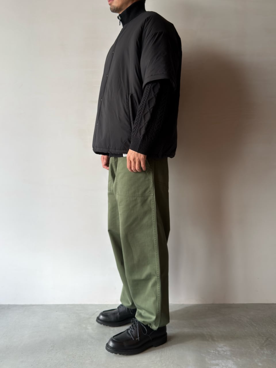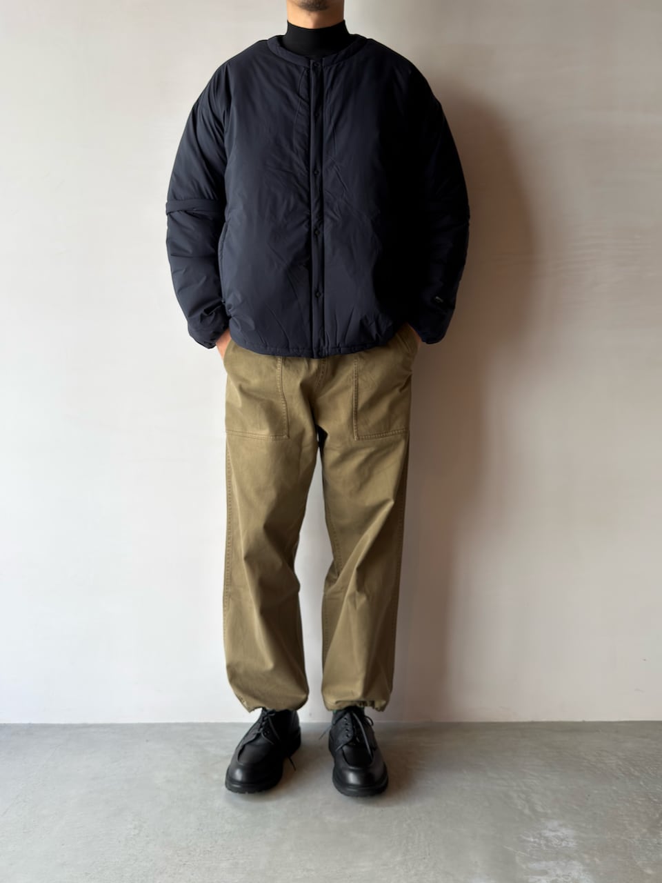 最大の特徴でもある袖の取り外しが可能なジップ付きで、様々な気候と気温に対応可能なほか、薄手のロンTやシャツ、肉感のあるスウェットやニットなどにもレイヤードスタイルで、様々なスタイリングに変化を加えることを楽しめます。首元がノーカラータイプとなる事からモックネックやハイネック等の首元にワンポイントを構築してみるのもいかがでしょうか?寒暖差の大きな時や長時間の移動時などは半袖対タイプにするのも便利です。