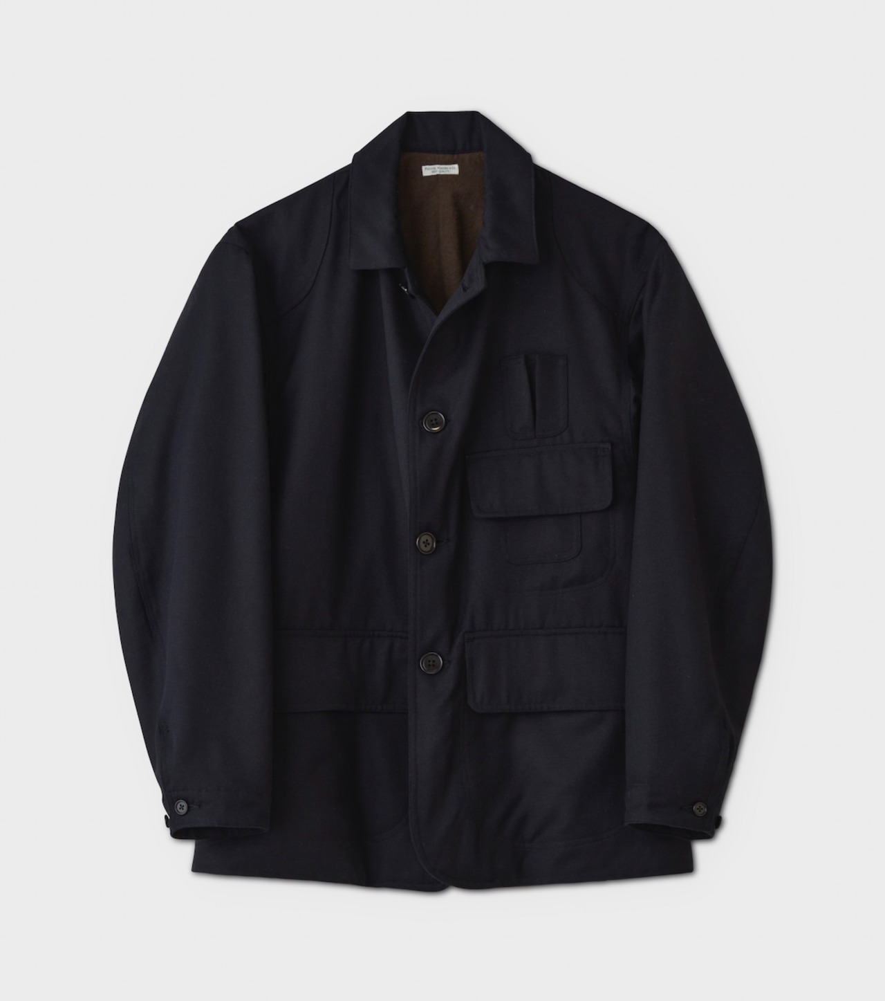 The PHIGVEL W/CA HUNTING JACKET is crafted from a grosgrain poplin wool fabric woven using a blend of carded and combed wool.