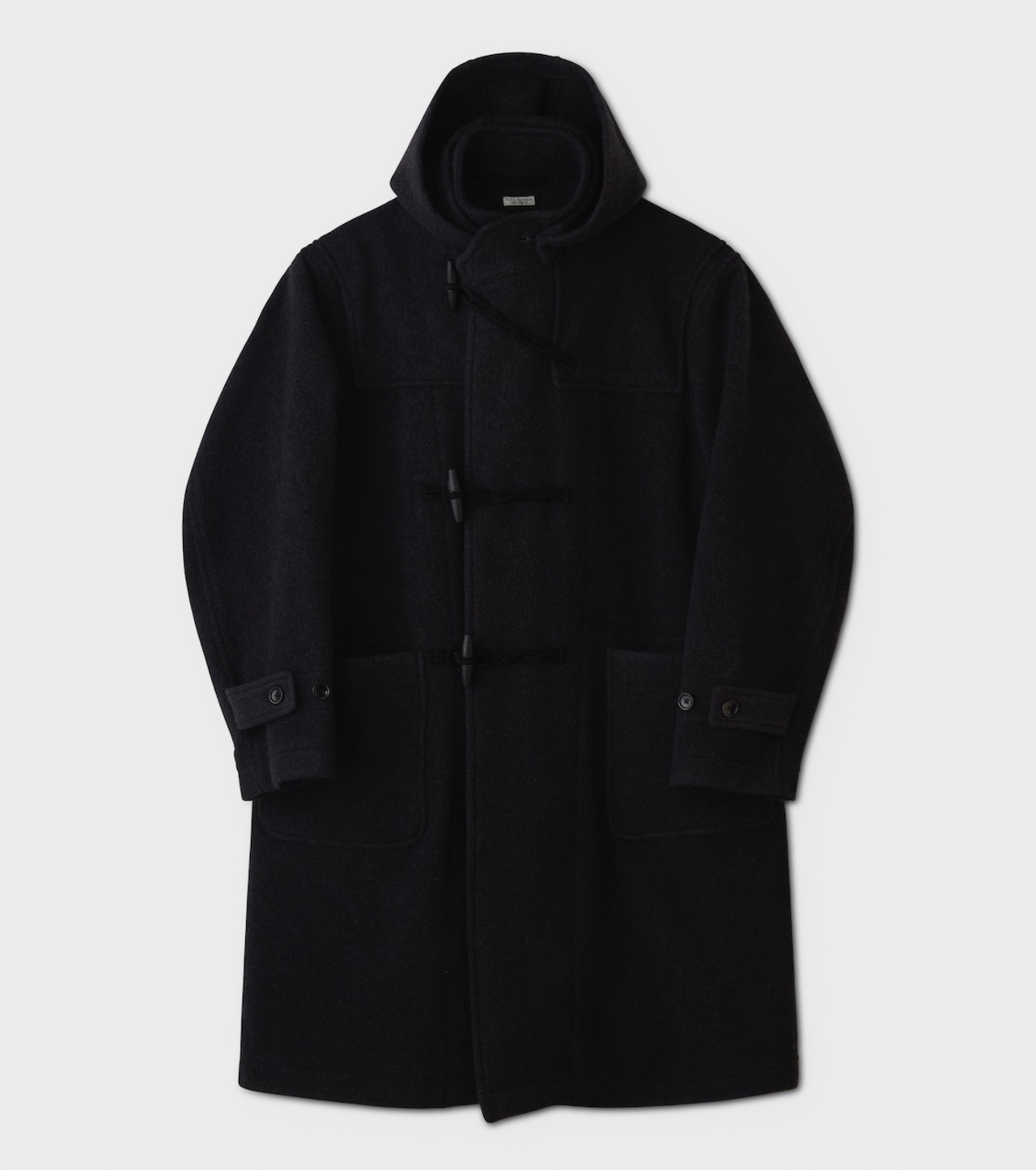 The PHIGVEL NAVAL DUFFLE COAT is crafted from blanket wool fabric woven from a blend of wool cashmere and British wool. This classic duffle coat offers substantial thickness yet remains soft, combining warmth with a premium texture.