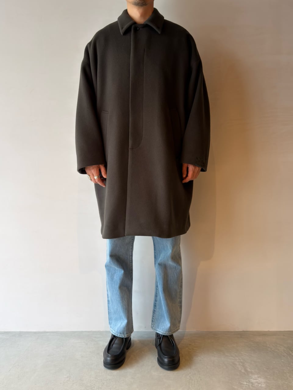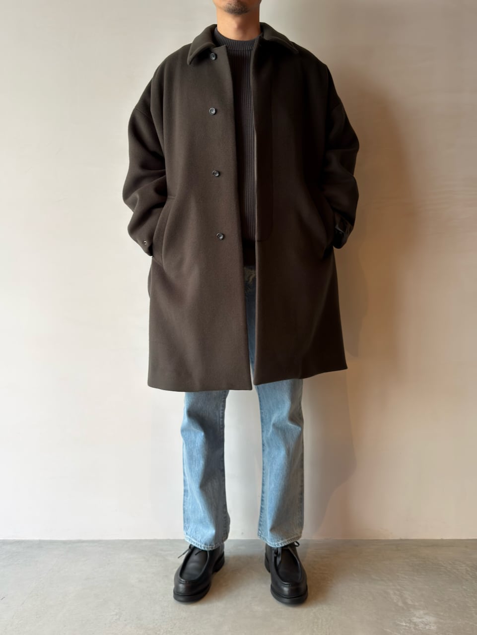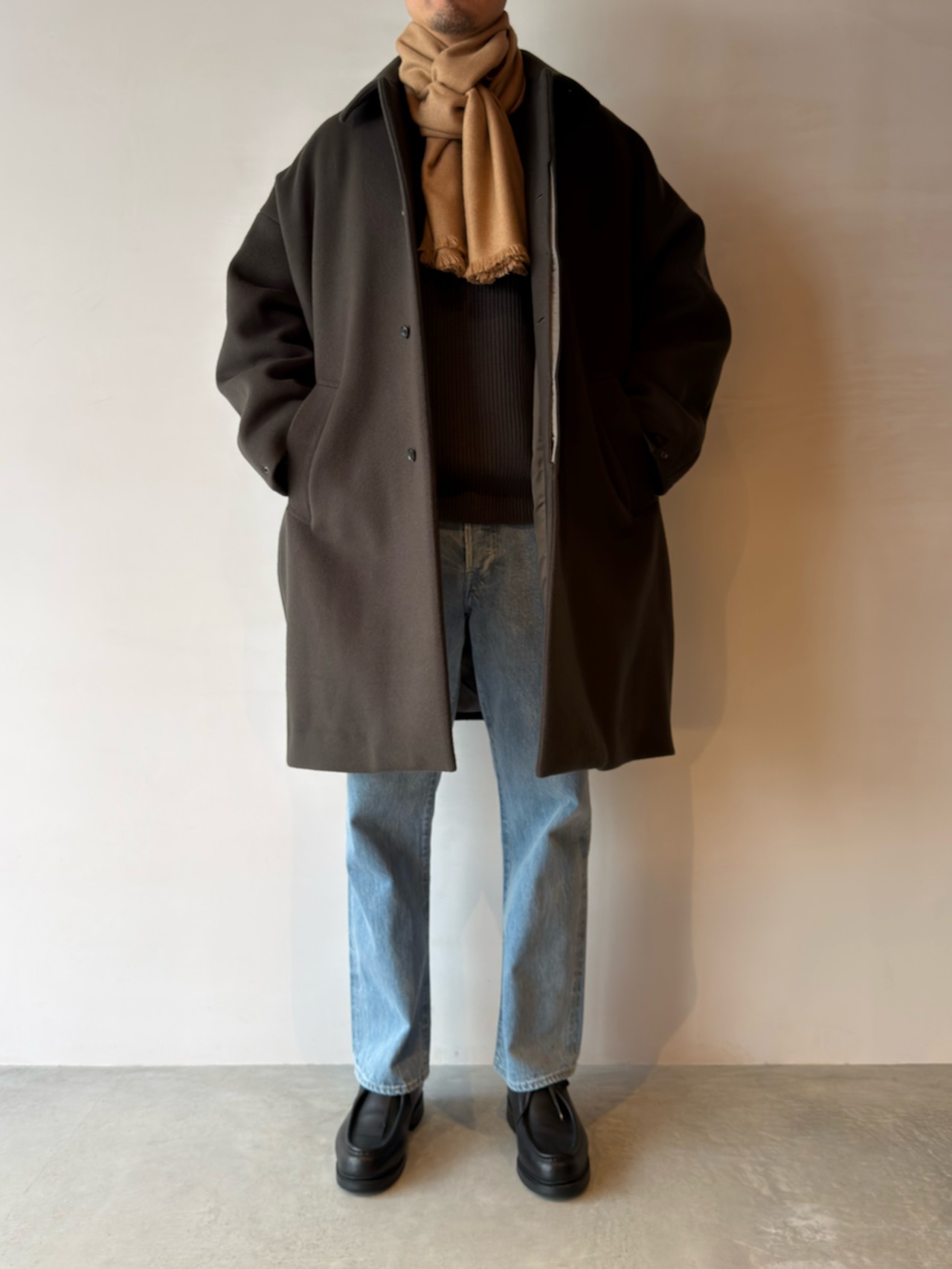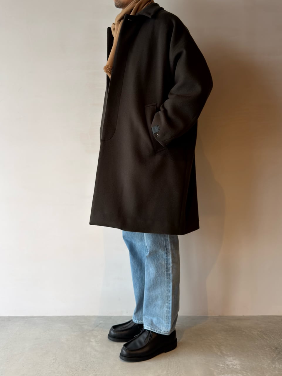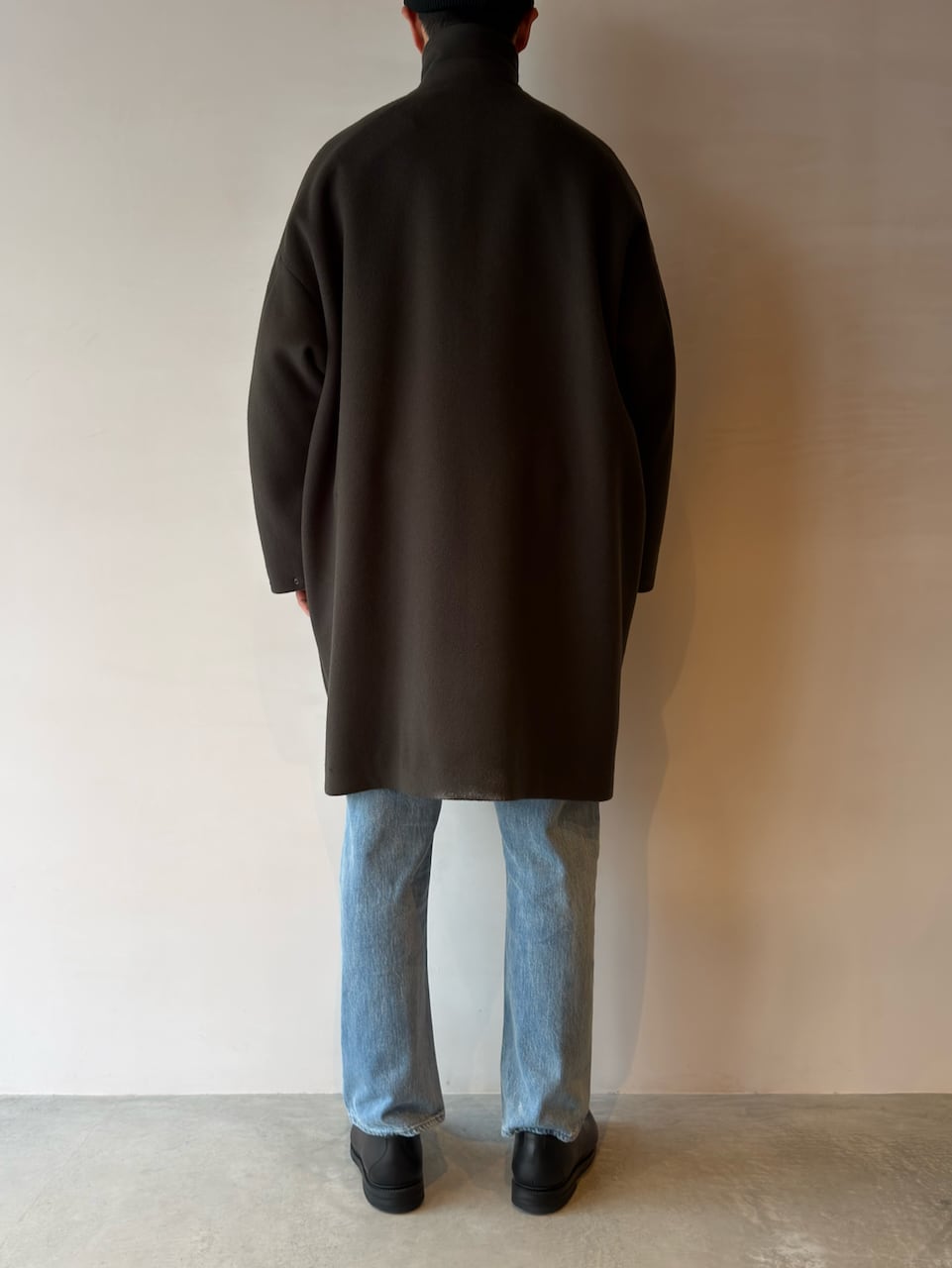 The silhouette features dropped shoulders for an oversized look. Paired with a long, straight-cut length, it achieves a balance of enveloping presence and refined sophistication. Versatile enough to layer over suits as an overcoat or wear daily over shirts, knits, or sweatshirts.