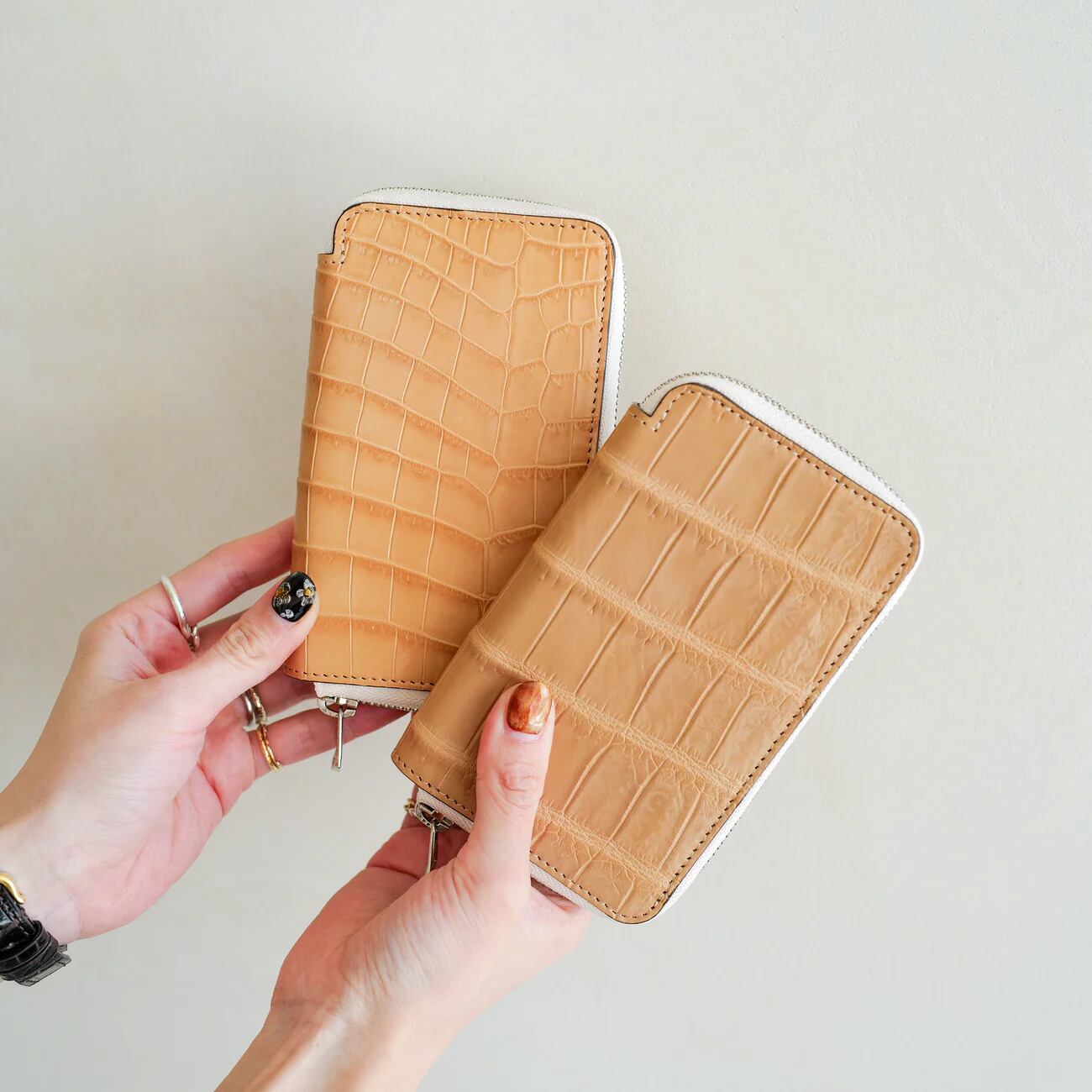 “NUME CROCO” is created by re-tanning crocodile leather base material with tannin, achieving an appearance and aging process similar to vegetable-tanned leather. This leather uses base material from French company HCP, a partner supplying high-quality exotic leather to the Maison, and is finished domestically. Rather than cutting for maximum luxury, the designer personally cuts the leather from edge to edge to preserve the overall feel and character of the crocodile hide. This allows the user to imagine its usage scenarios.