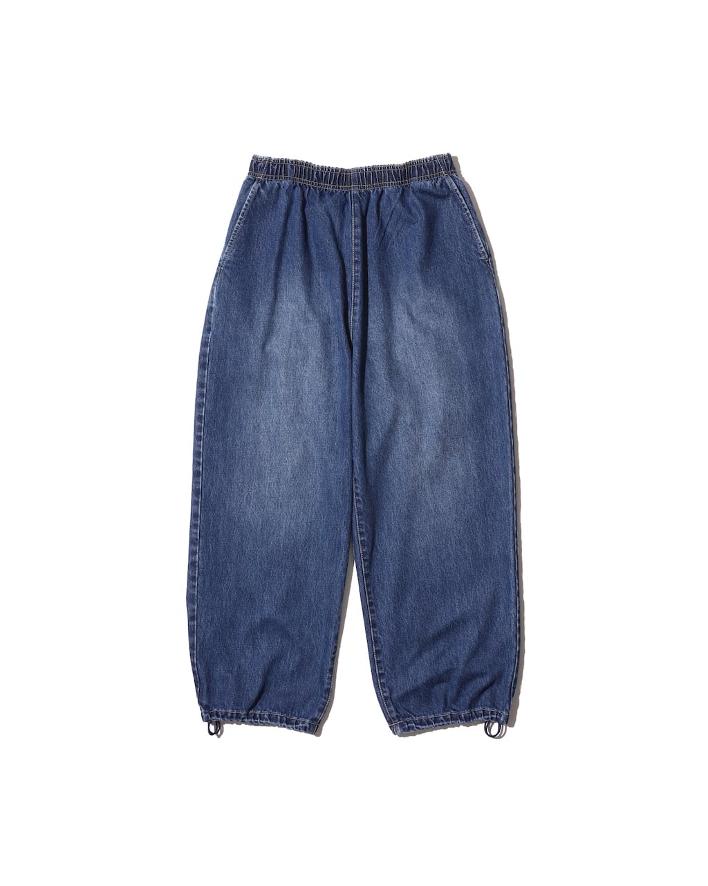 13.5ozのタフなデニムを採用し、ワイドシルエットながらも過度に重くならないバランスに設計。ウエストはイージー仕様、さらに裾にもドローコードを備えており、気分やスタイリングに合わせてシルエット調整が可能です。