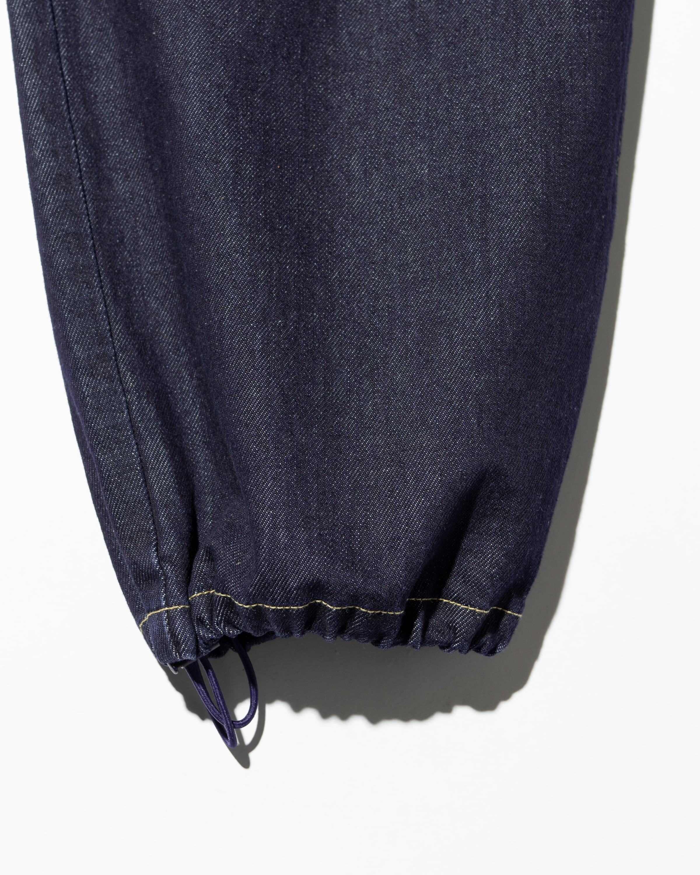 13.5ozのタフなデニムを採用したワイドシルエットのイージーパンツ。ウエストに加え、裾にもドローコードを備えており、気分やスタイリングに合わせてシルエットの調整が可能。