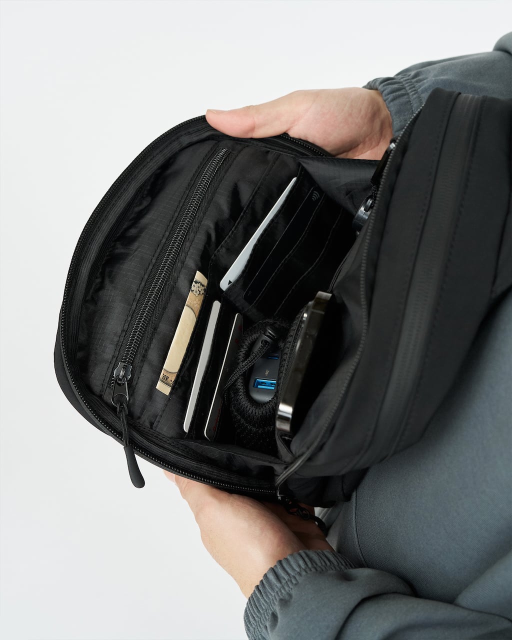 A sling bag equipped with multi-functional pockets. Designed to reliably and securely carry your essentials.