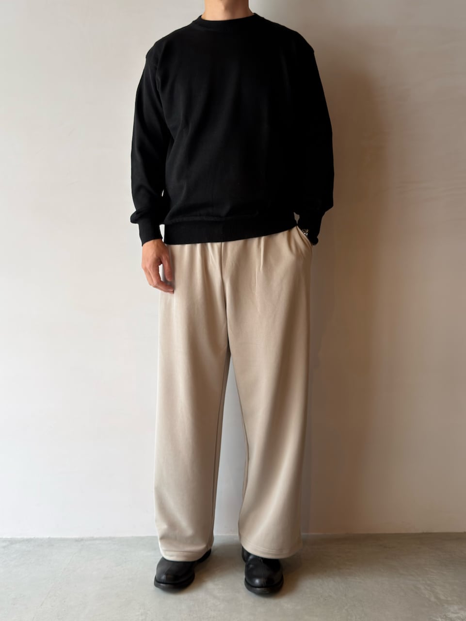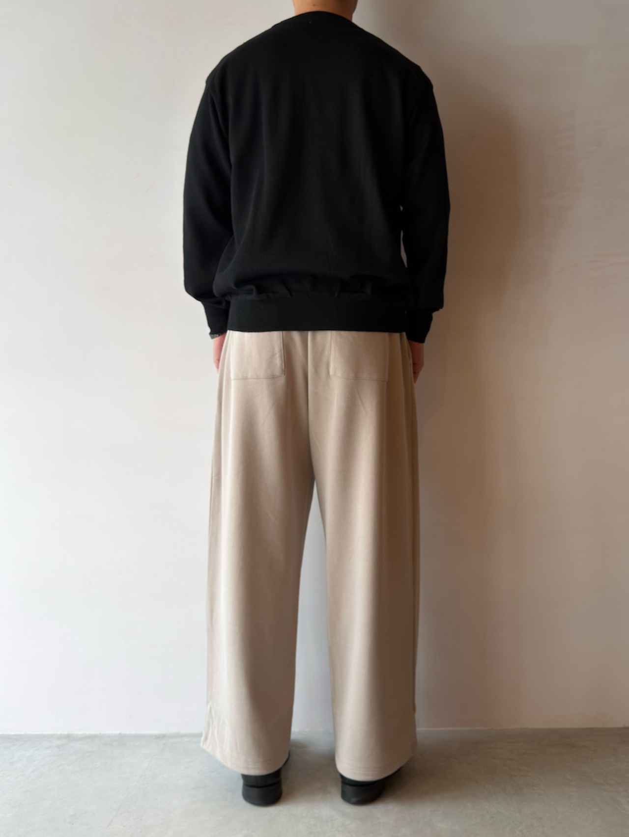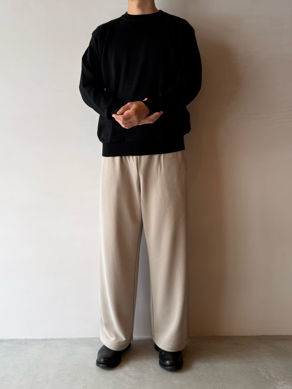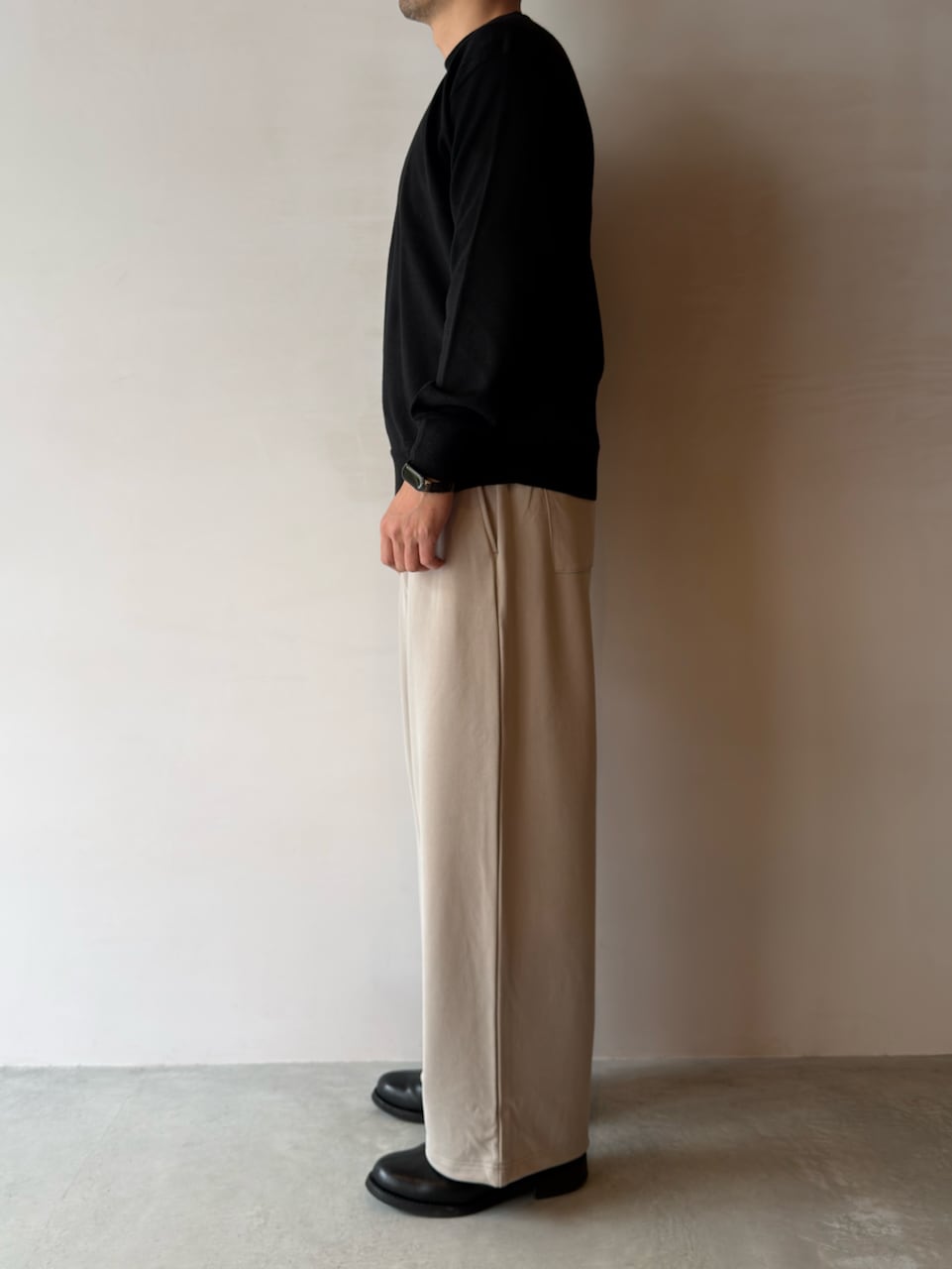 With a weight between sweatshirt and jersey, it can be worn all year round. These wide-leg pants are made with generous amounts of our favorite fabric. The fabric drape when cinched at the waist is superb. A straight-leg wide-leg pant with a clean, straight silhouette from the thigh down. The drawstring at the hem allows for various silhouette options.