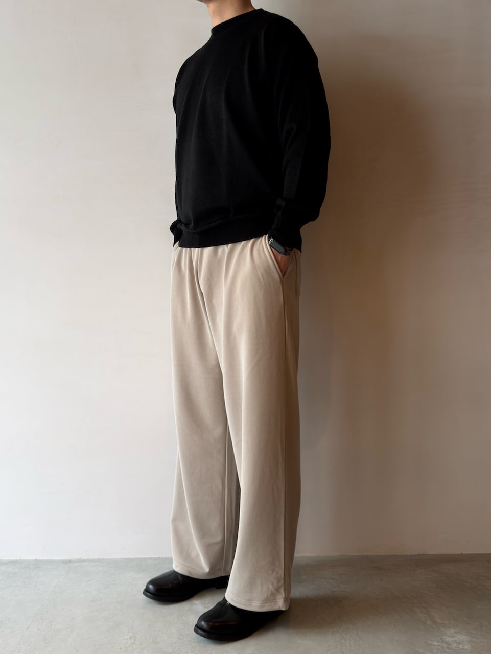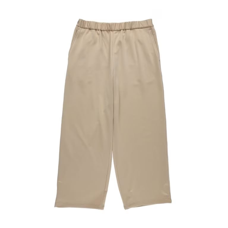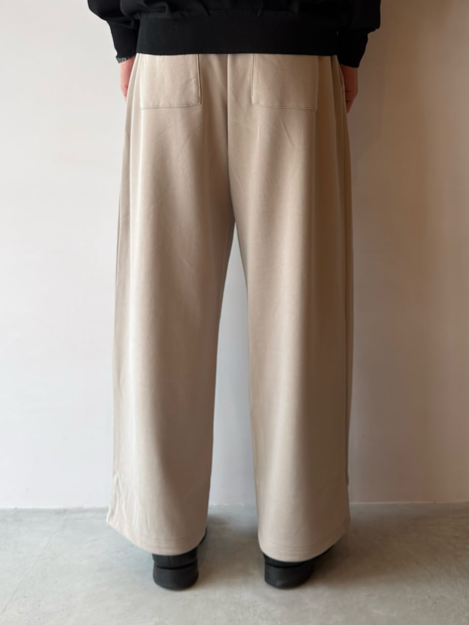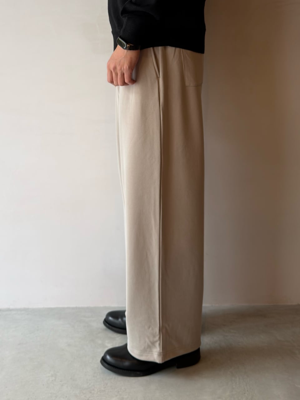 With a weight between sweatshirt and jersey, it can be worn all year round. These wide-leg pants are made with generous amounts of our favorite fabric. The fabric drape when cinched at the waist is superb. A straight-leg wide-leg pant with a clean, straight silhouette from the thigh down. The drawstring at the hem allows for various silhouette options.