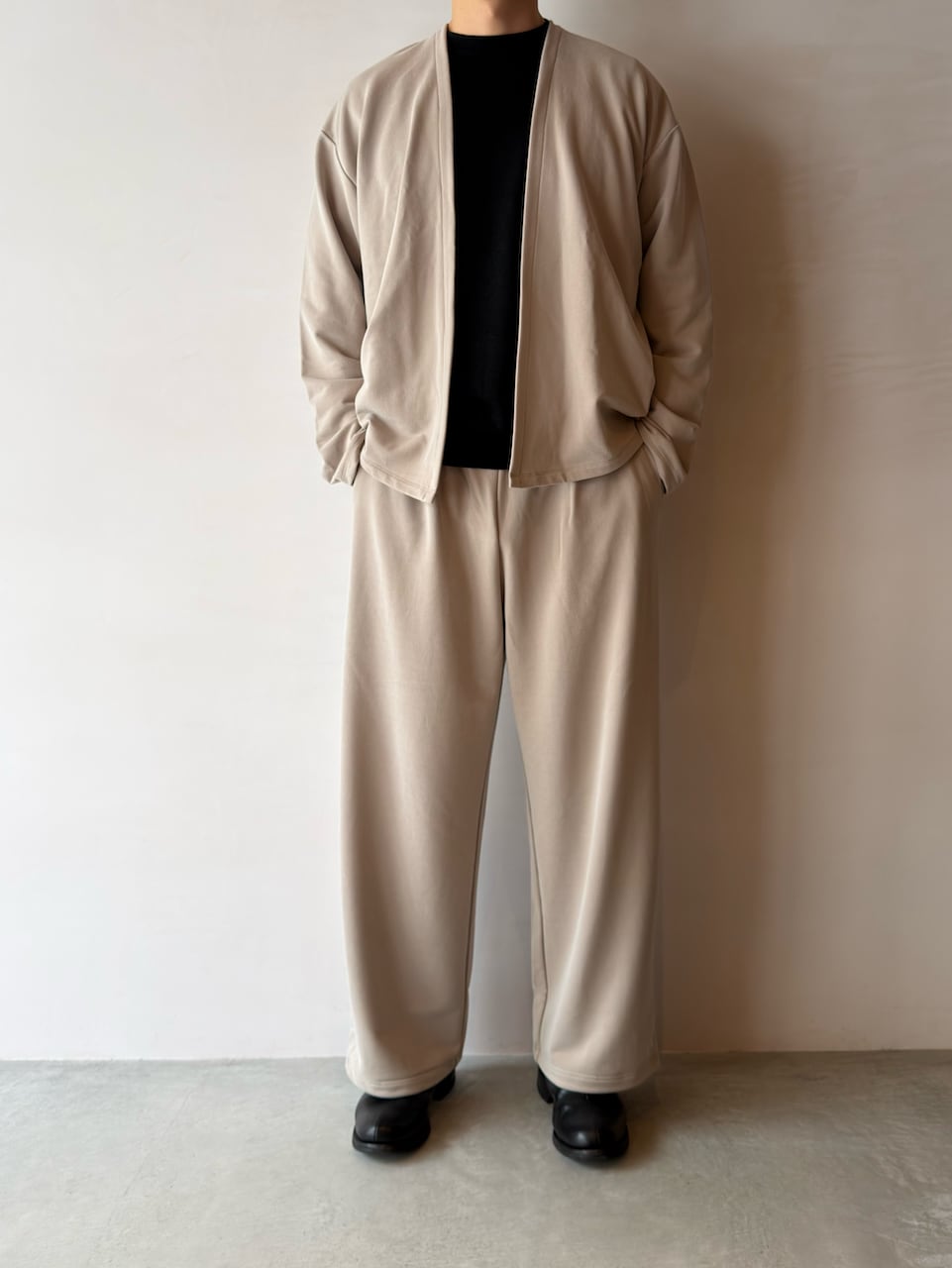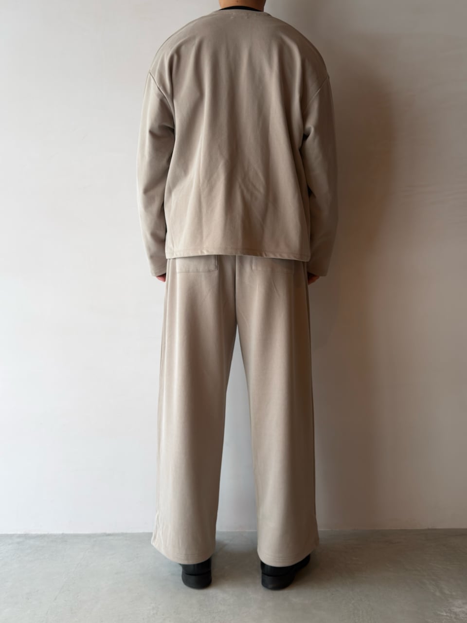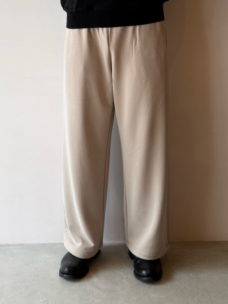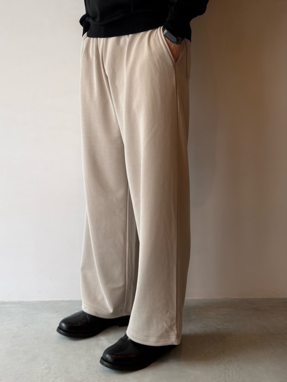 With a weight between sweatshirt and jersey, it can be worn all year round. These wide-leg pants are made with generous amounts of our favorite fabric. The fabric drape when cinched at the waist is superb. A straight-leg wide-leg pant with a clean, straight silhouette from the thigh down. The drawstring at the hem allows for various silhouette options.