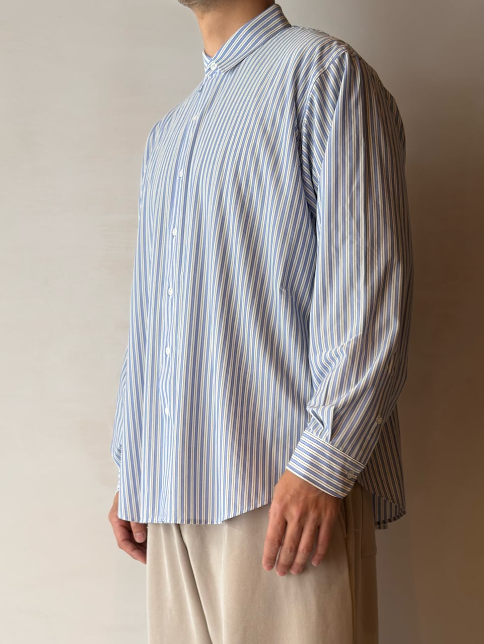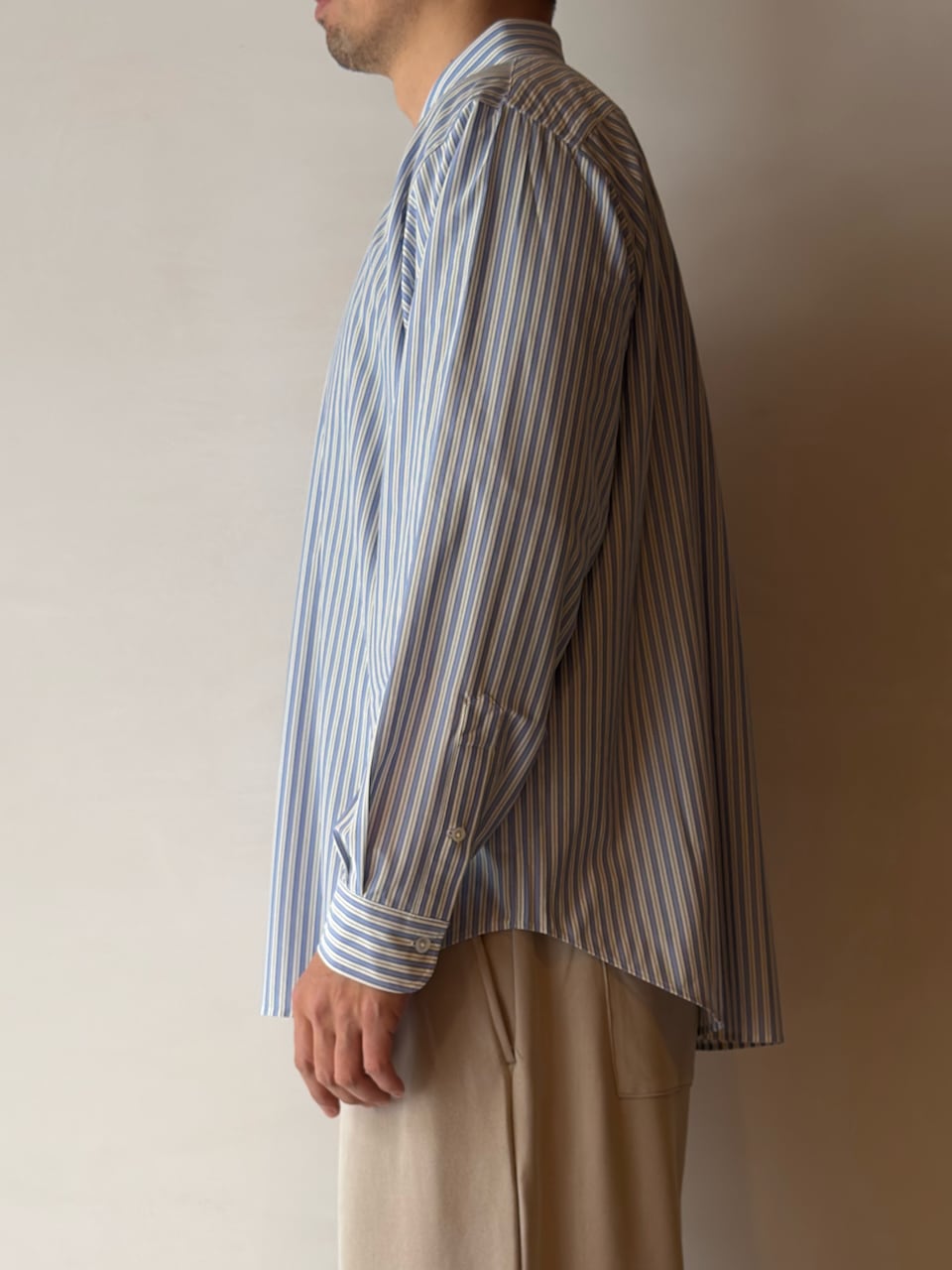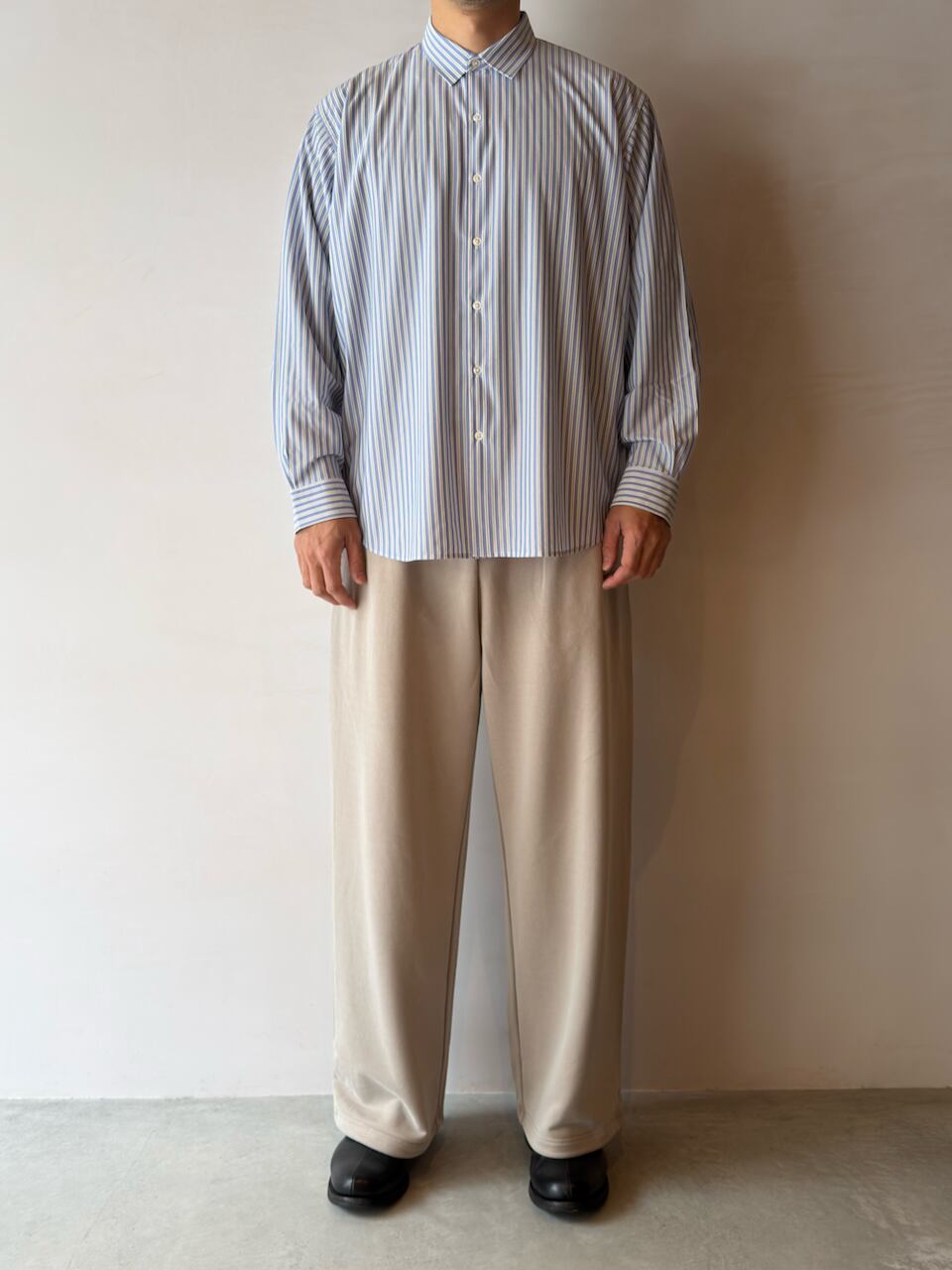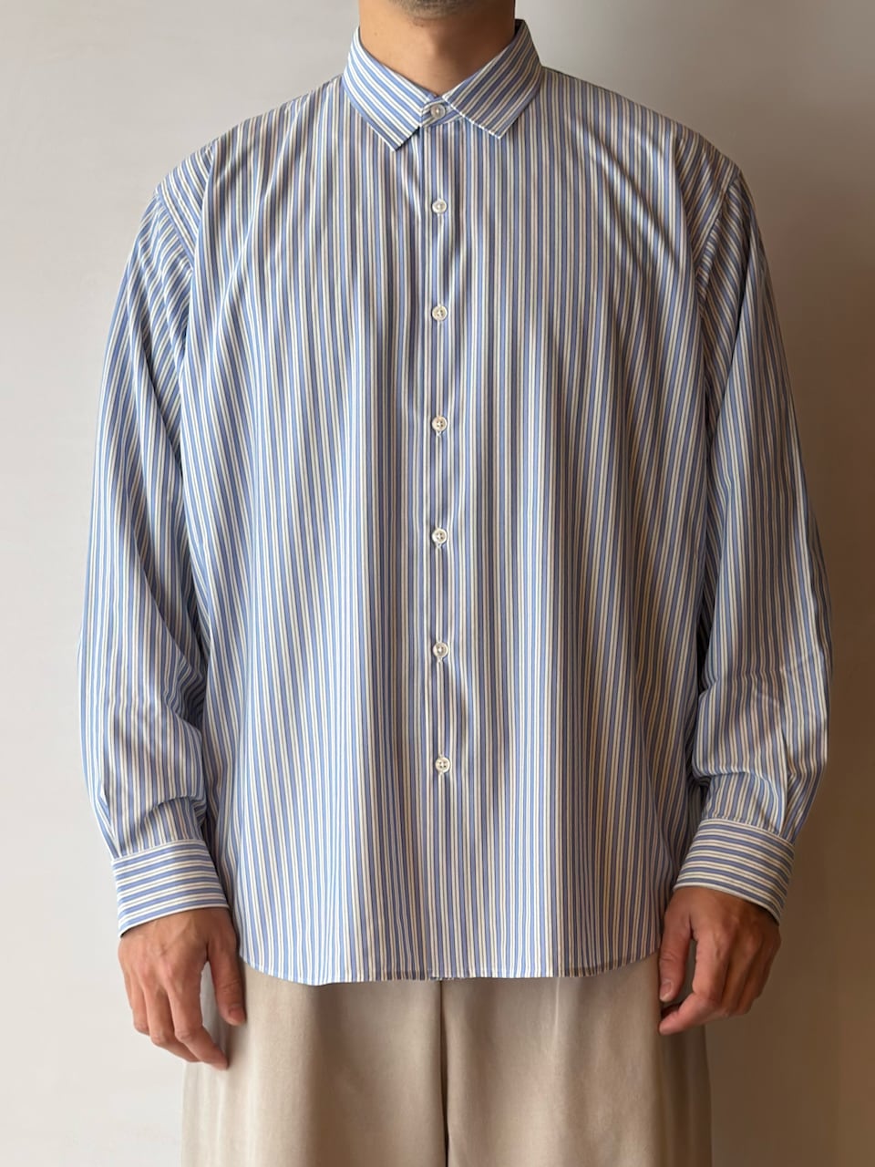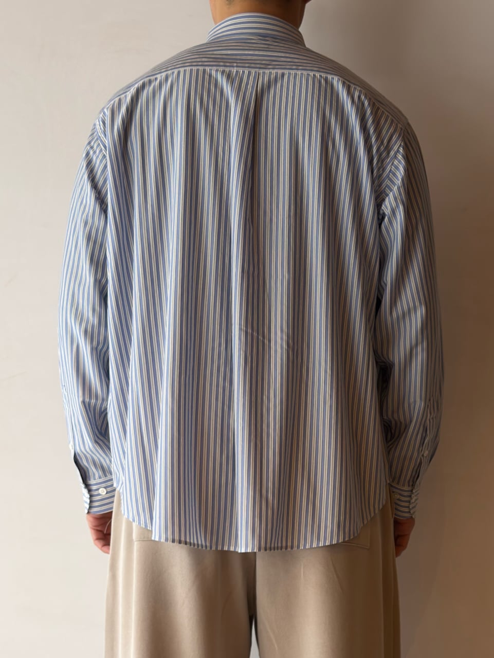 今シーズンから釦裏側にブランドロゴを入れております。KANEMASA PHIL.の定番ルーズシルエットシャツ。