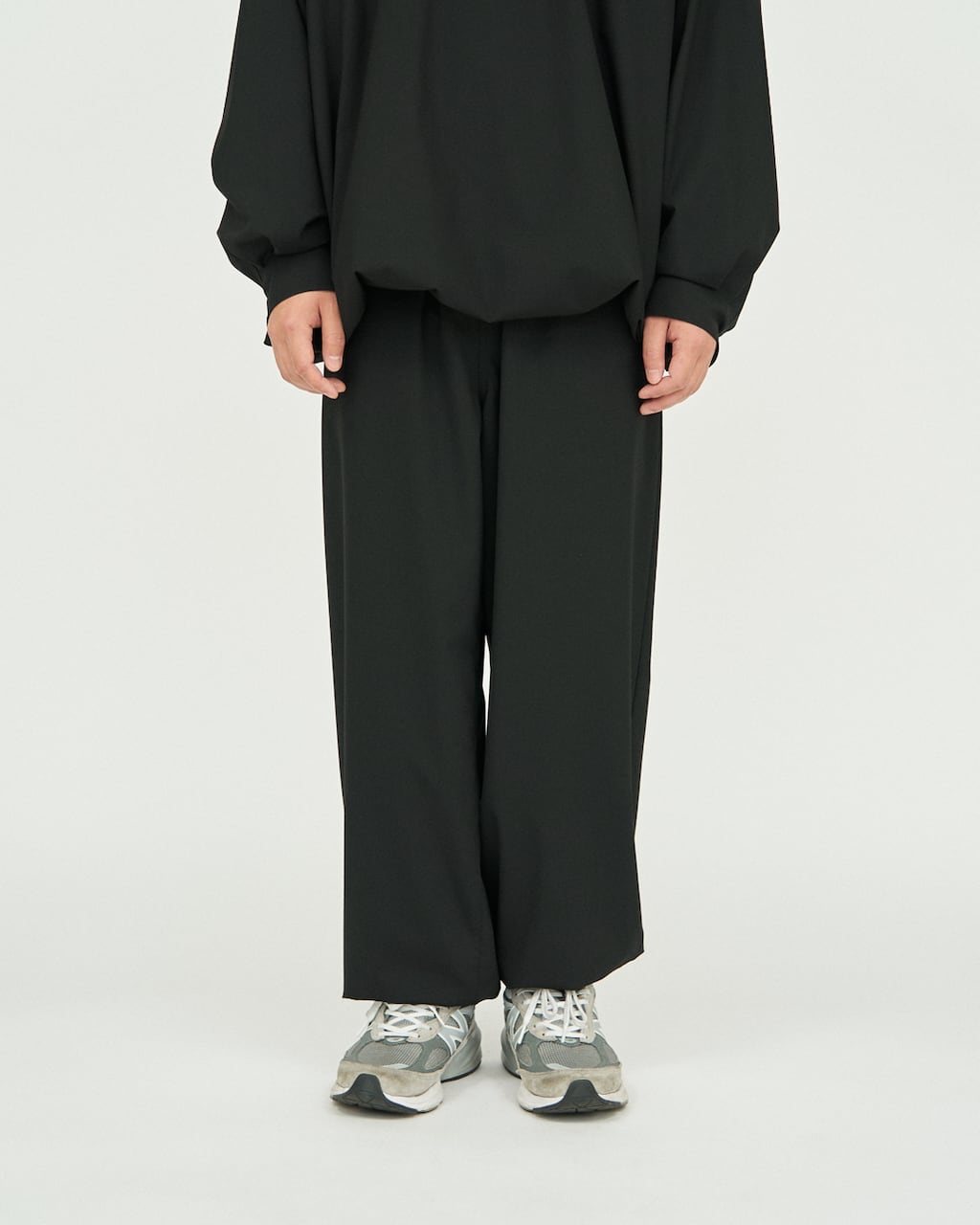 It also offers excellent stretch for sustained comfort. Drawstrings at the waist and hem allow silhouette adjustment. Cinching the hem transforms the look into a track pant-like style, enabling versatile styling for different occasions.