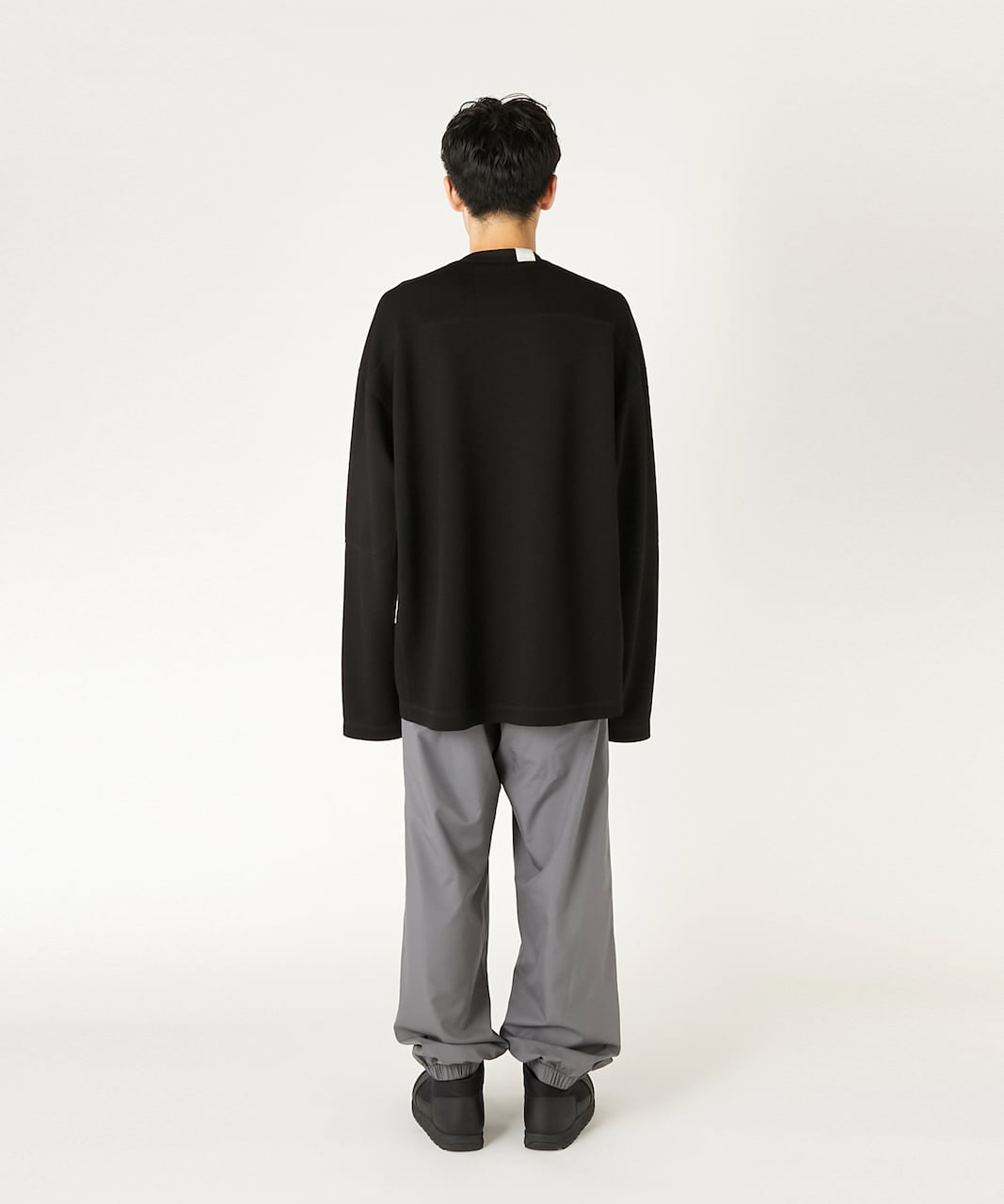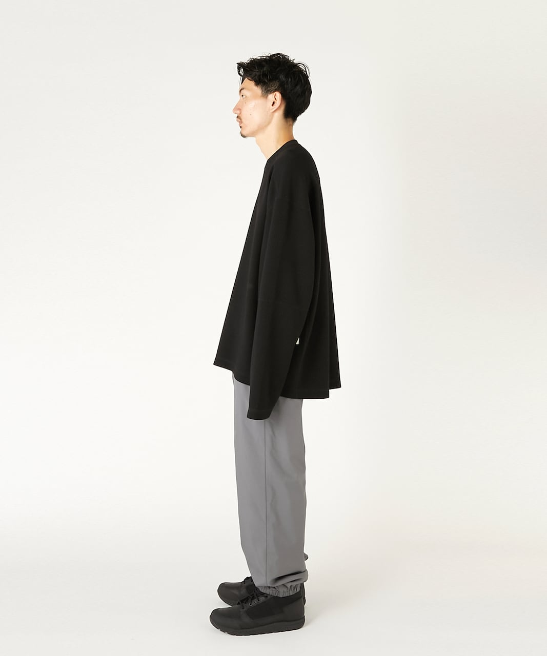 ドロップショルダーに、ゆとりを持たせたボックスシルエットを採用。リラックスした着用感と立体的なフォルムを両立しています。素材には特殊ポリエステルを使用した軽量ジャージを採用。