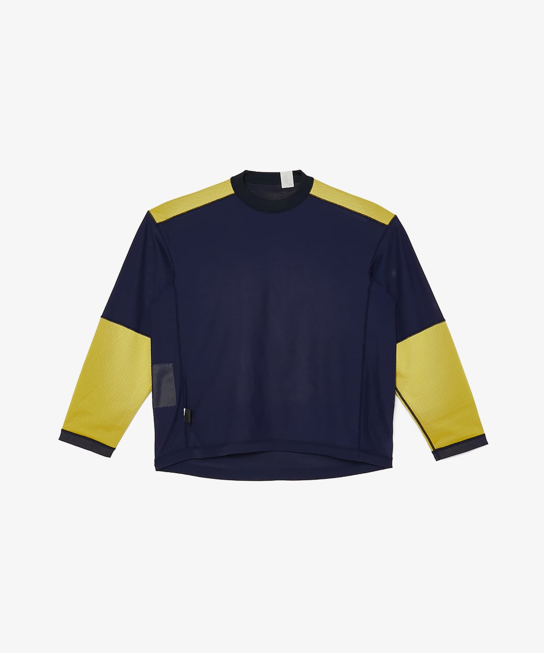 A long-sleeve T-shirt featuring striking sleeve and back panel accents. Its reversible design with contrasting color schemes on each side allows for versatile styling.