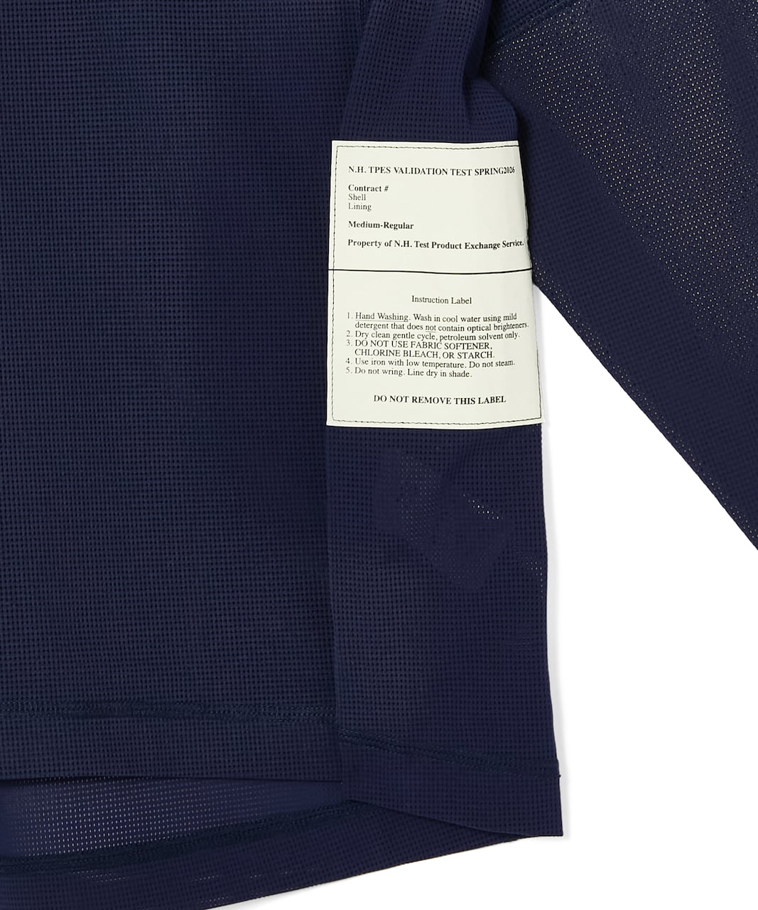 The original military specs are placed on the left hem, while the size specs are on the inside back, expressing the distinctive product feel of the TEST PRODUCT EXCHANGE SERVICE.