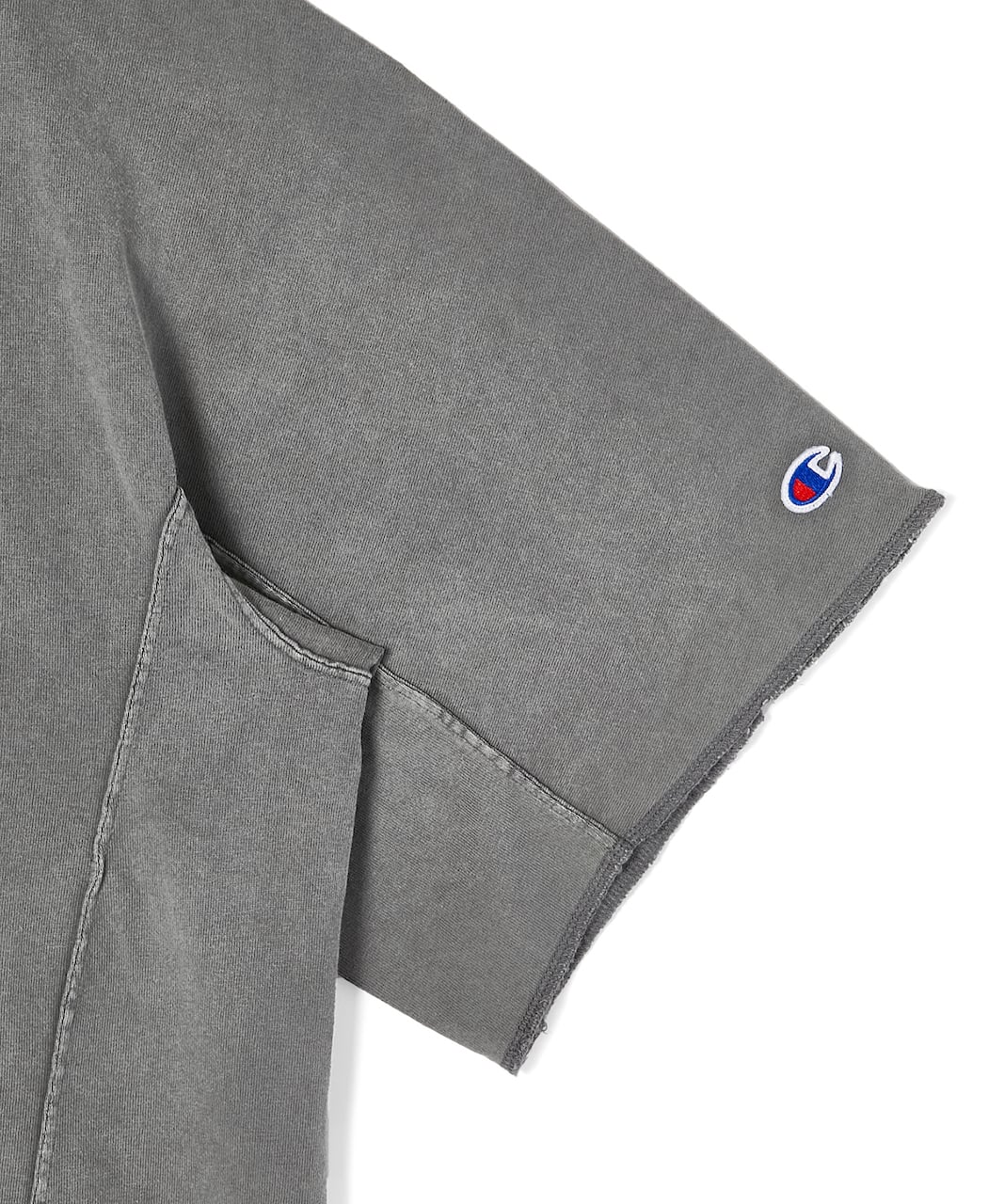 動きやすさと存在感を両立させたバランスに仕上げられています。端はロックミシン仕上げとし、軽快な印象に。左袖にはChampionのCロゴワッペンを配置し、ネック後ろには両ブランドのロゴを組み合わせた専用タグをセット。