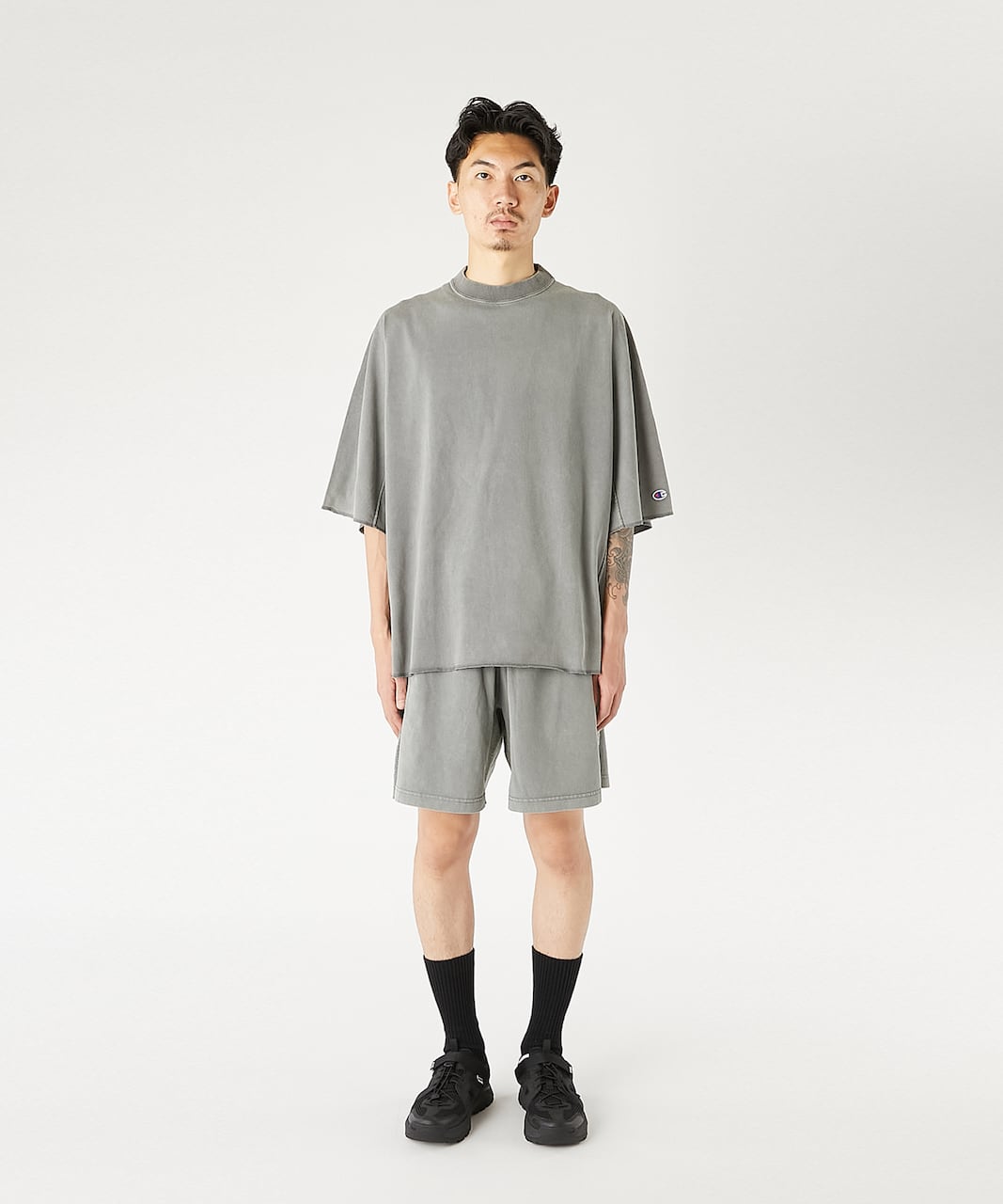 This subtly expresses the heritage of both brands. The above-the-knee length and wide silhouette achieve both lightness and balance. Crafted from an original brushed fabric co-developed with Champion and soft 100% cotton jersey, garment dyeing recreates a vintage-like texture.