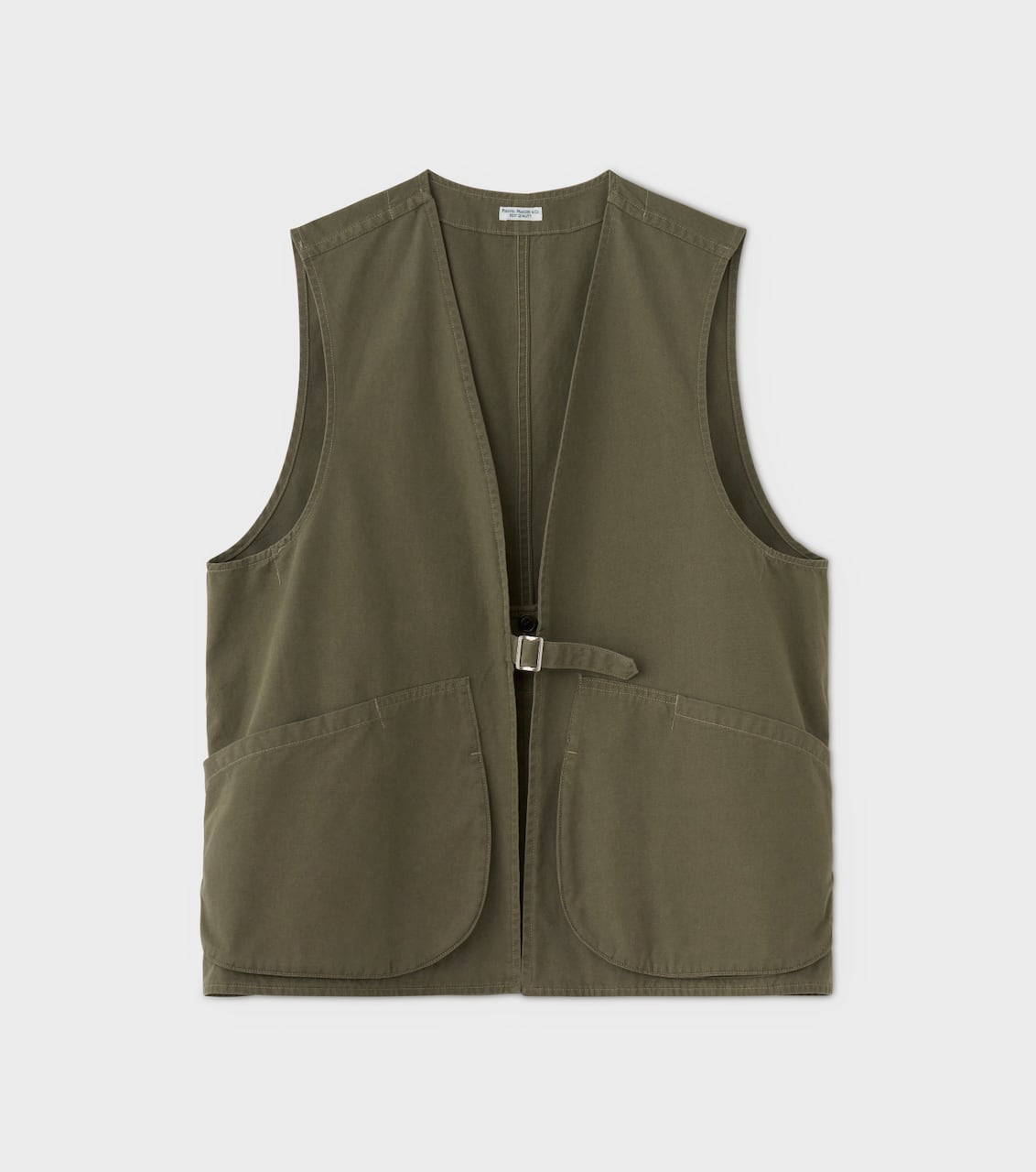 A hunting vest crafted from poplin fabric—commonly used in fatigue jackets—and available in original colors. Based on a classic hunting vest design, it features a distinctive layout with pockets running all the way around the inside.