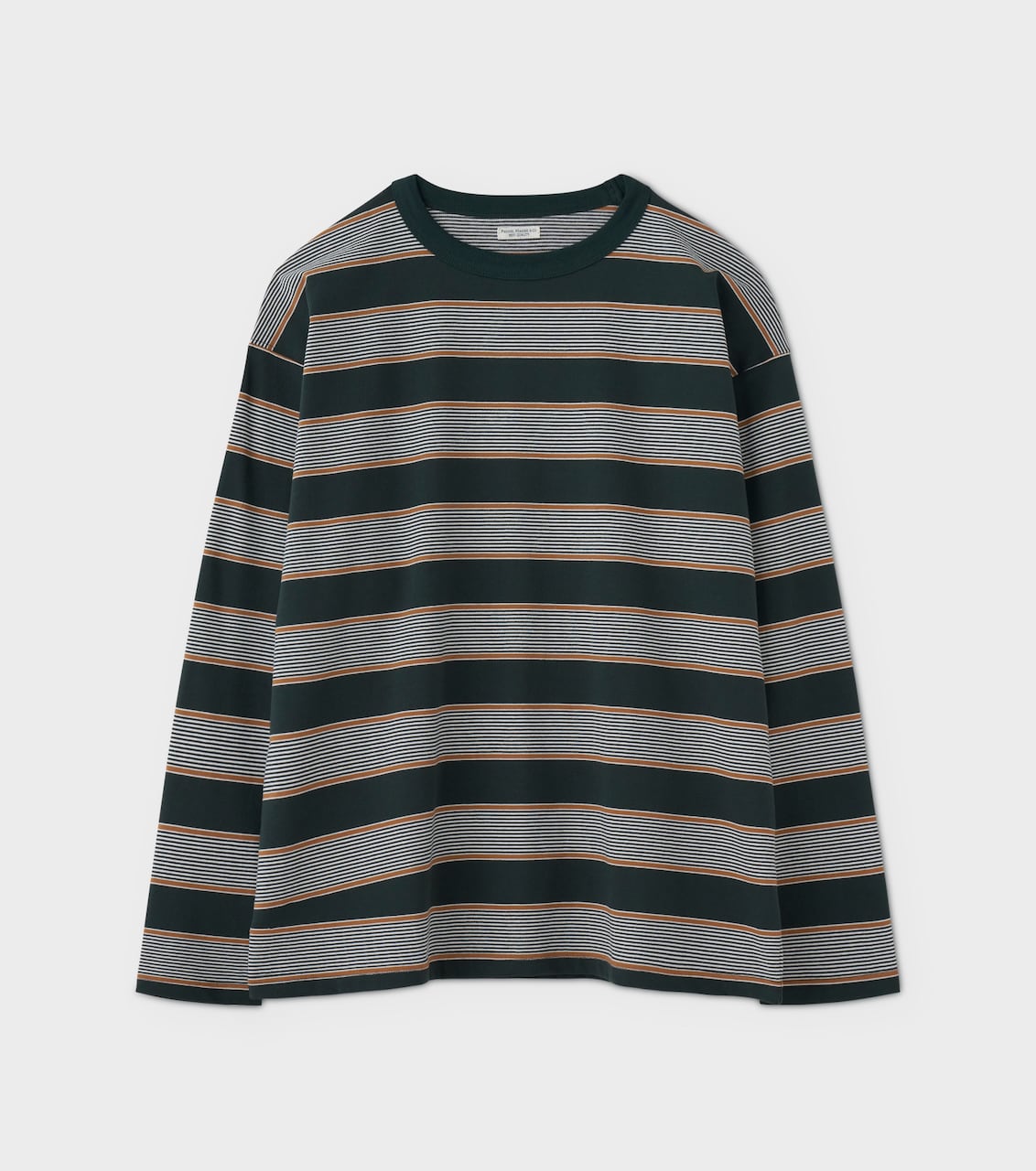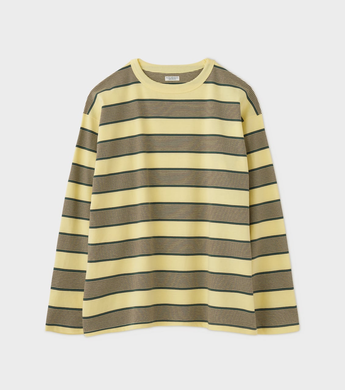 特殊加工を施したコットン糸を使用し、編み立てた先染めボーダー天竺のロングスリーブトップ。