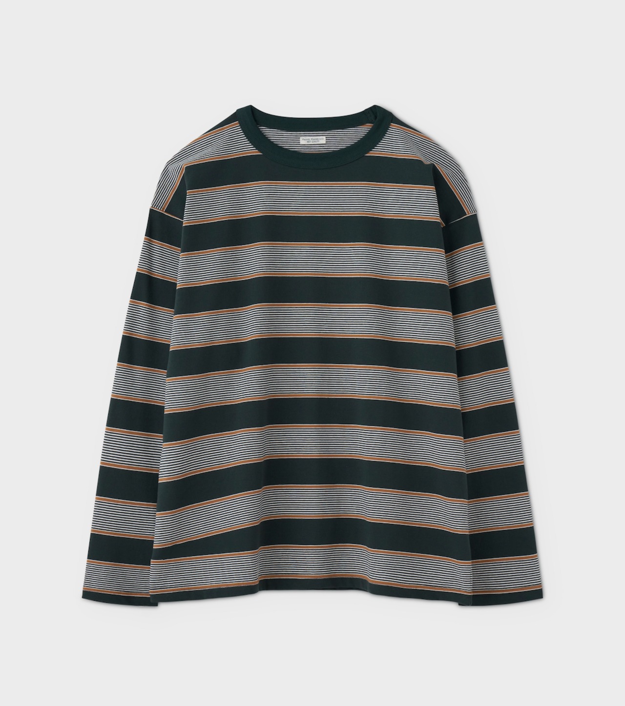 A long-sleeve top crafted from pre-dyed striped jersey knit using specially treated cotton yarn.