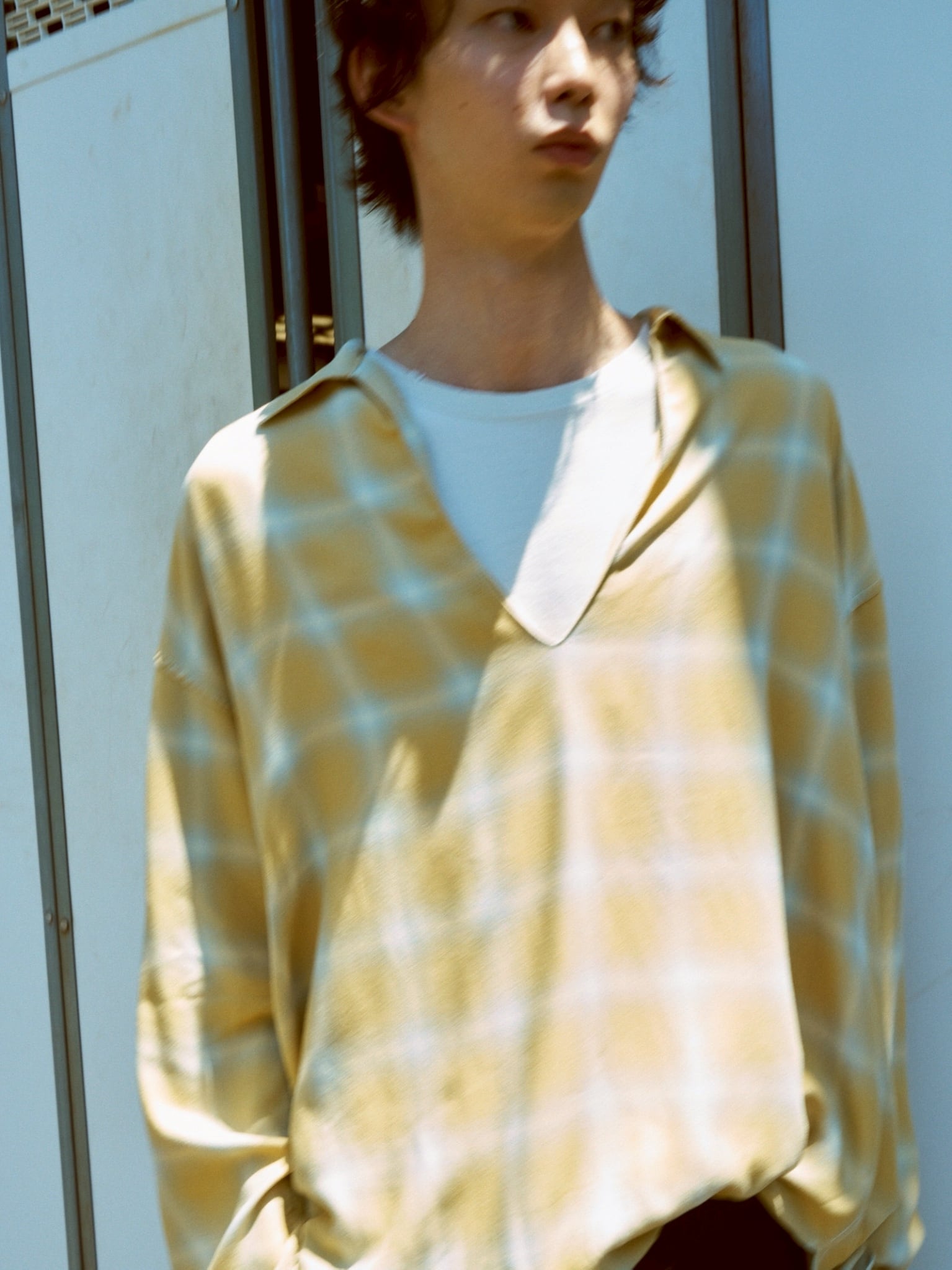 前後差をつけた着丈と深めのスキッパーデザインが、