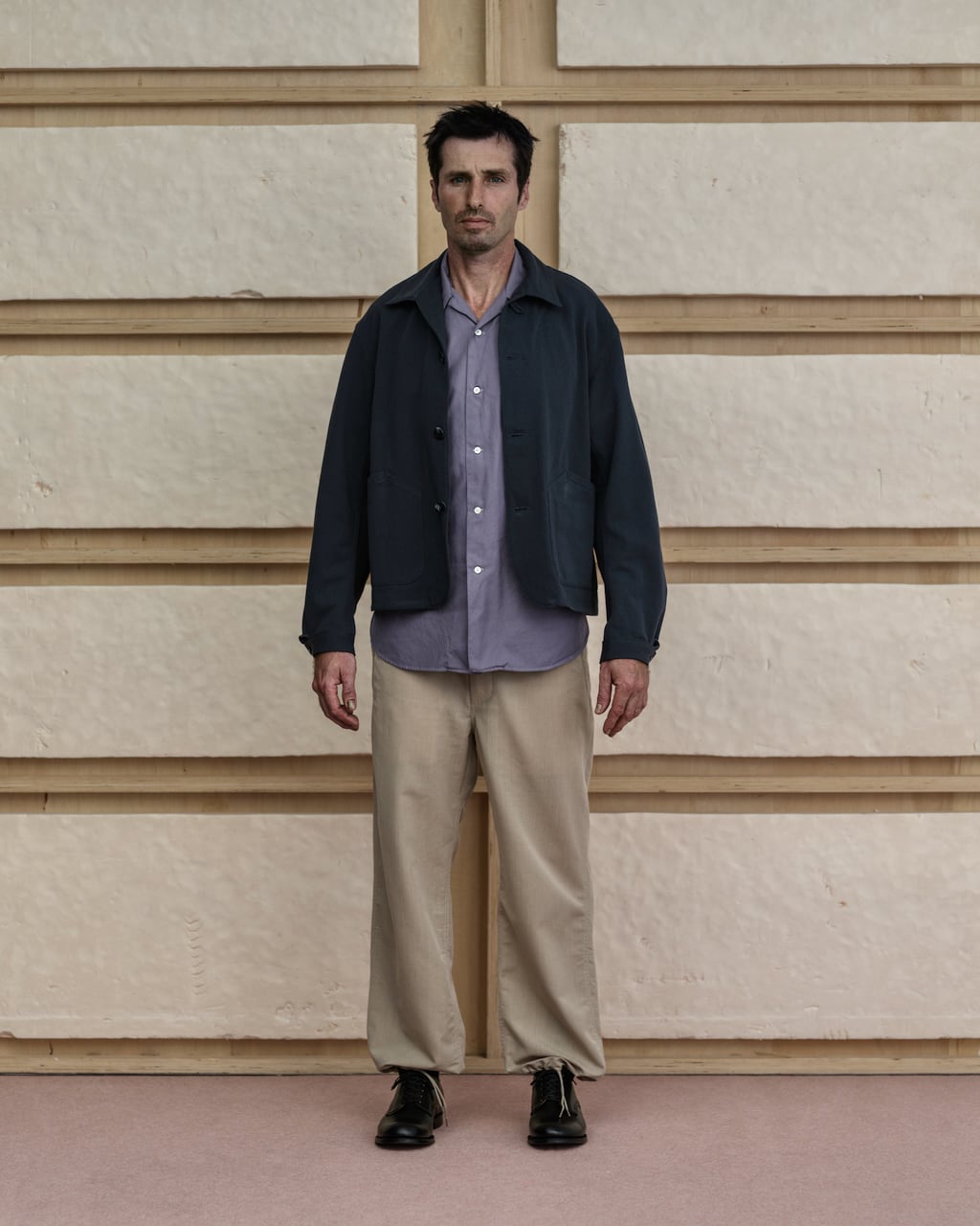 An original poplin chambray fabric woven with fine-gauge wool for the warp and a blend of wool, polyester, and cotton for the weft.