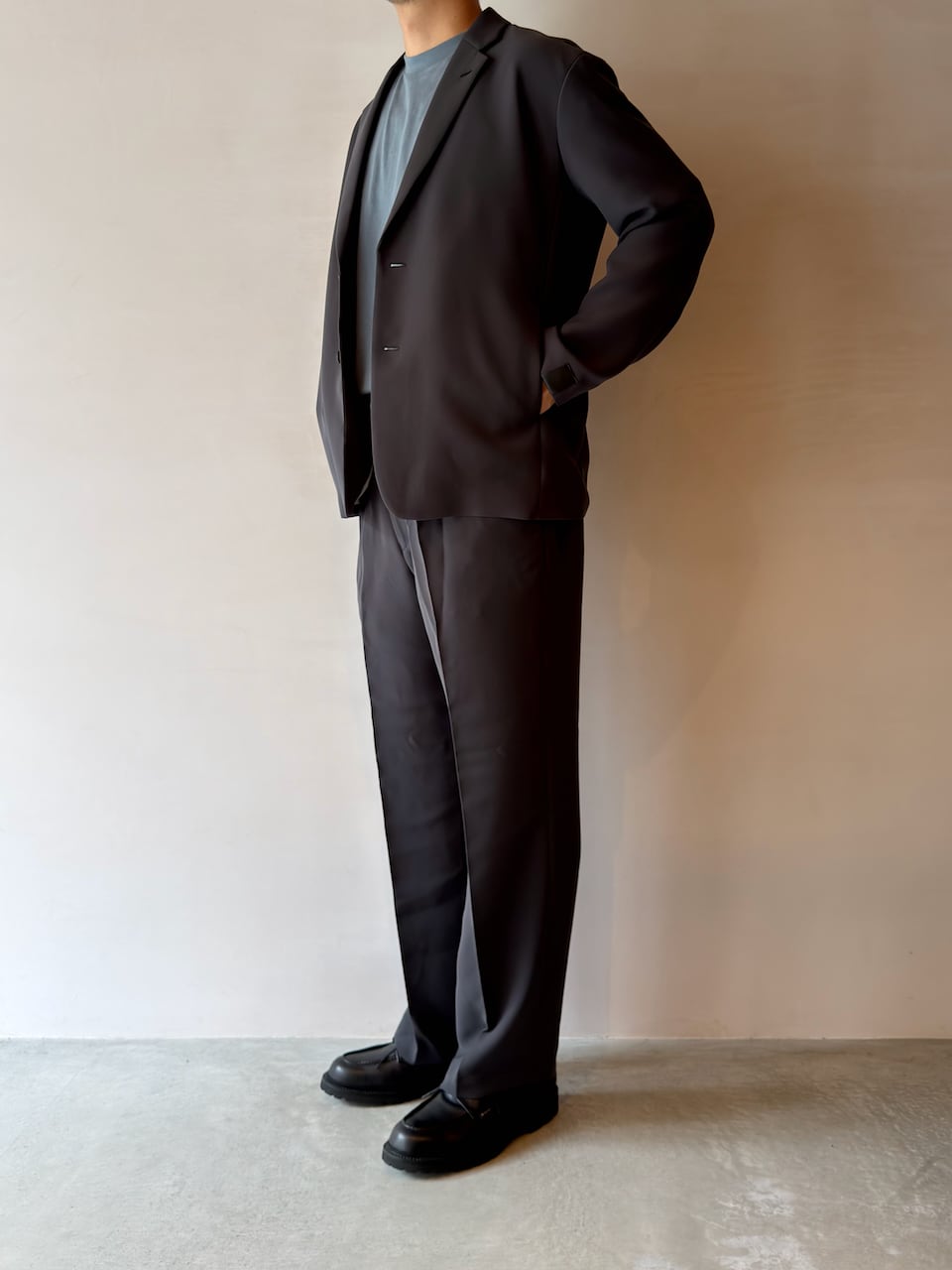 同生地のジャケットで着こなす際には、Tシャツやカットソーでリラックススタイルも良し、シャツインしての上品な着こなしを見せても、シャツにタイドアップしてファーマルよりに着こなしても楽しんで頂けます。
