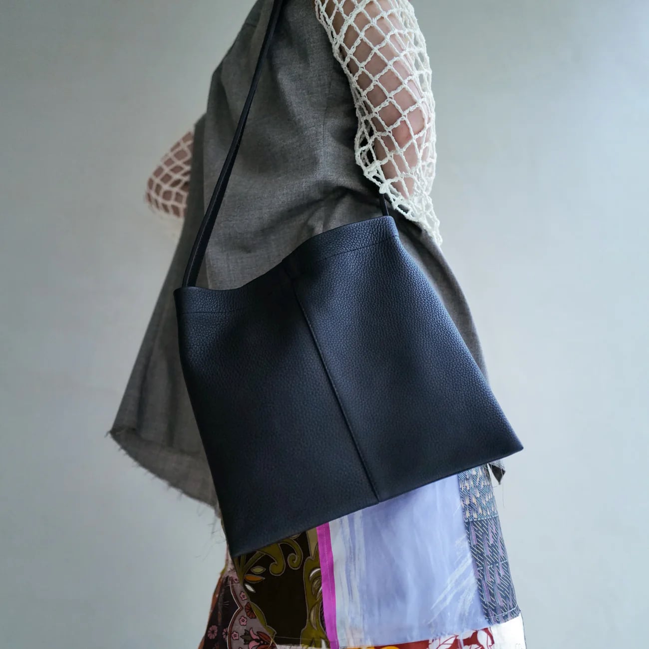 A leather shoulder bag with no gusset, offering the perfect size—neither too small nor too large.