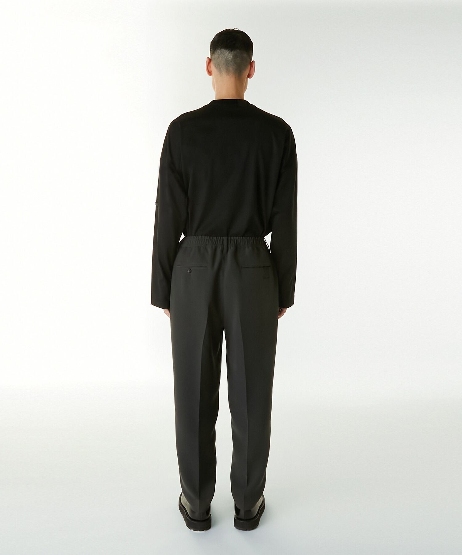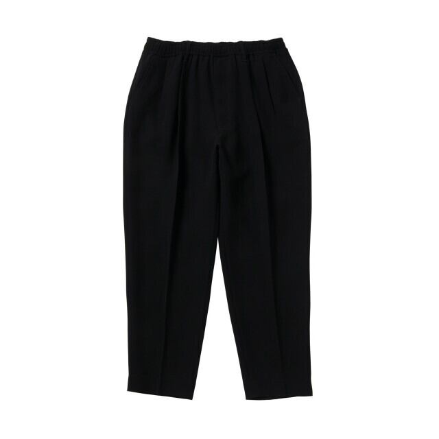 ツータックでわたりにボリュームを持たせつつ、テーパードを効かせた美しいシルエットで、ハリのある美しいドレープを生み出すポリエステルの中でも色の深いブラックを選び、より上品な印象になります。