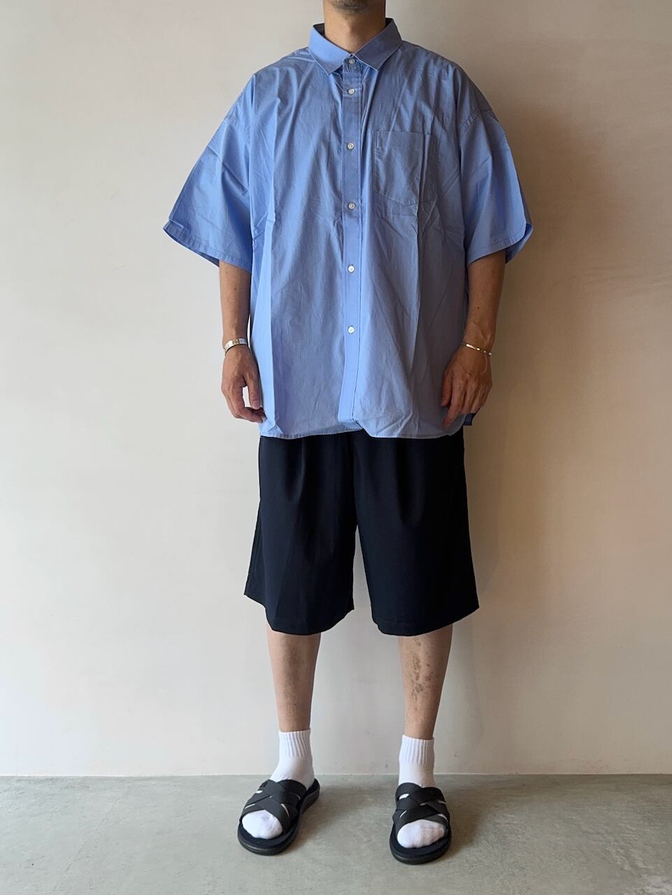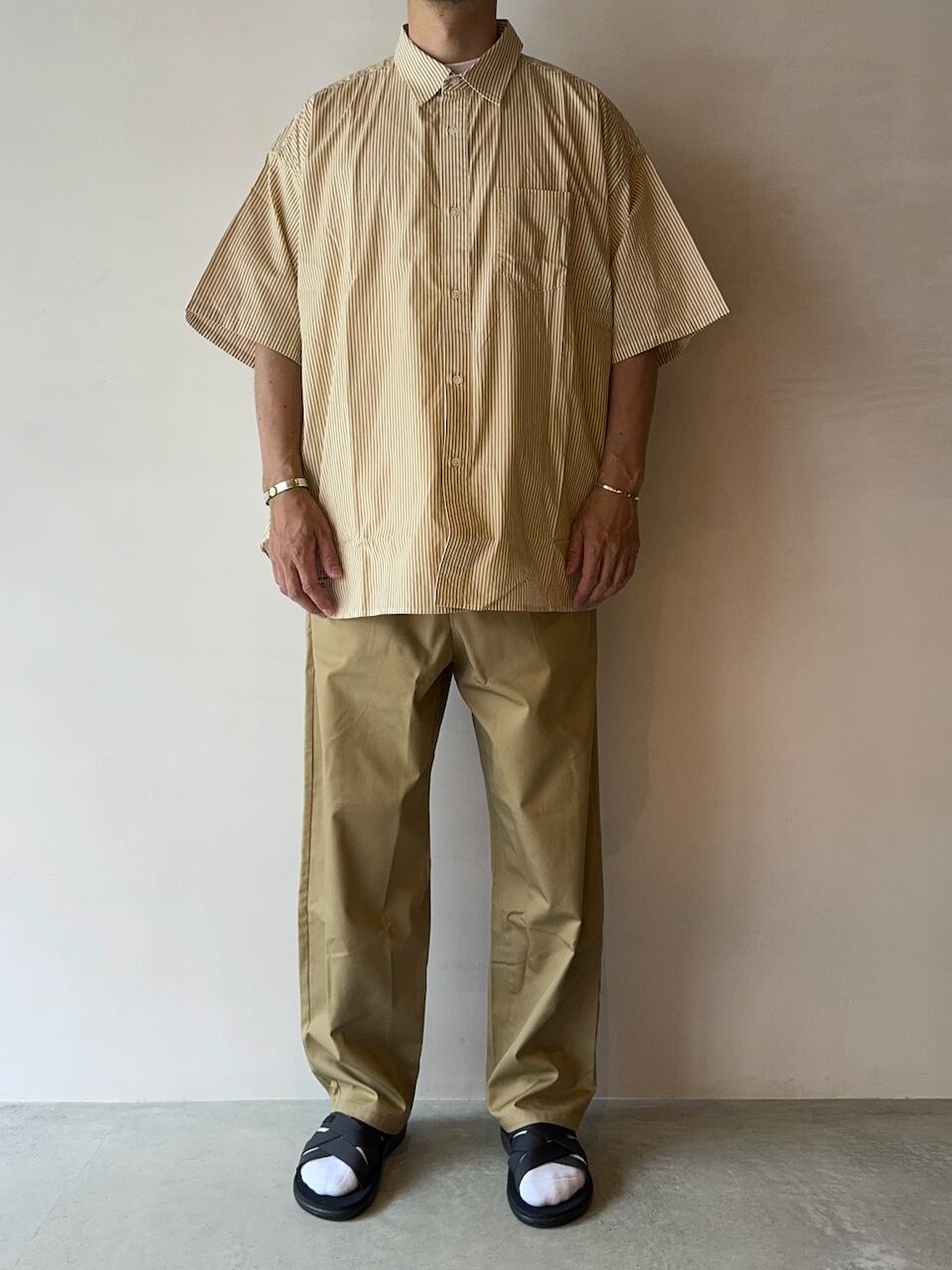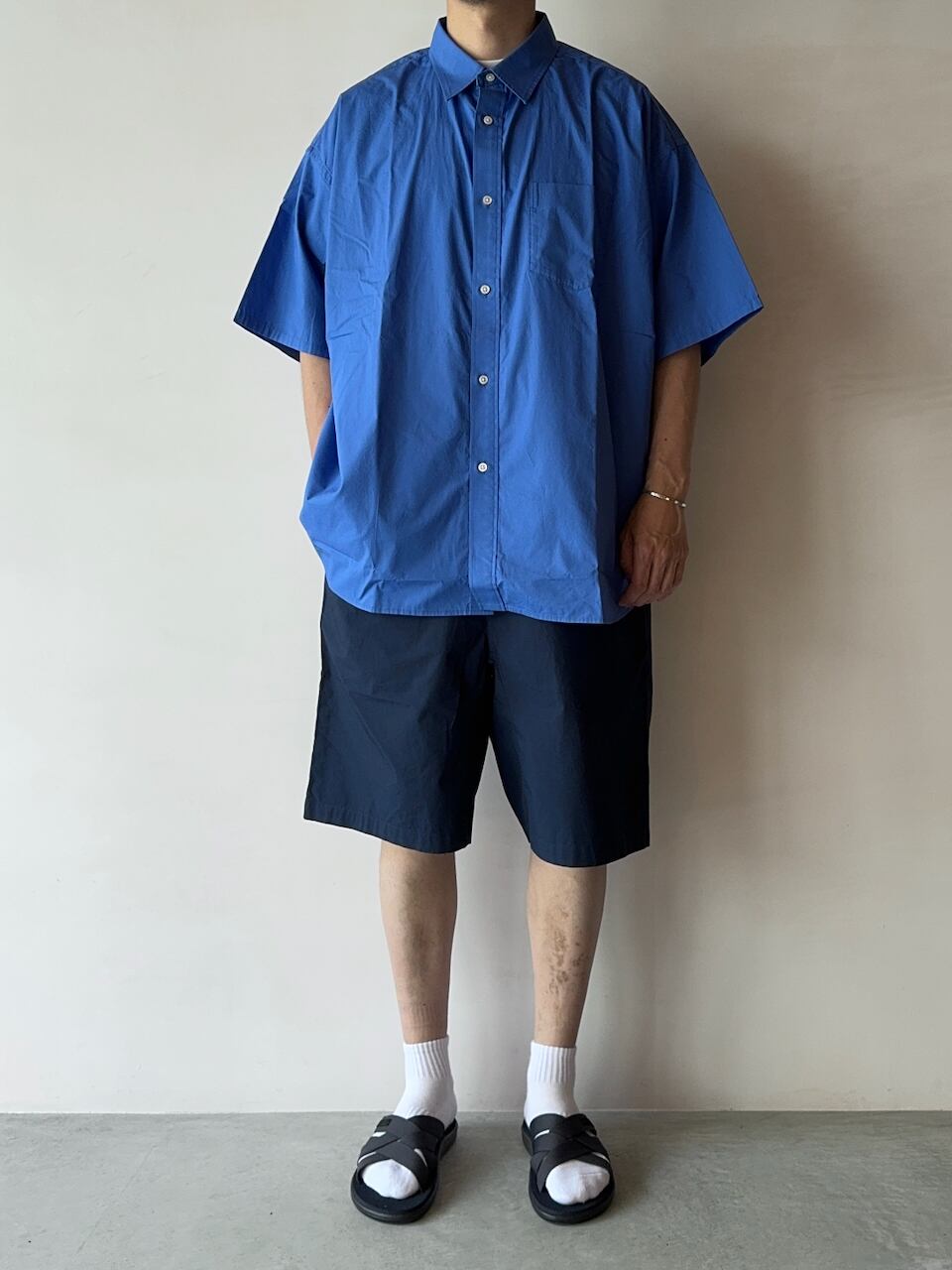 FreshServiceのCORPORATE UNIFORM S/S SHIRTは、架空の配送業者のユニフォームをイメージしたショートスリーブシャツです。ハリ感がありながらも滑らかな肌触りを持つ高密度に織り上げたコットンポプリンを採用しており、快適な着心地と耐久性を兼ね備え型崩れしにくい生地感です。